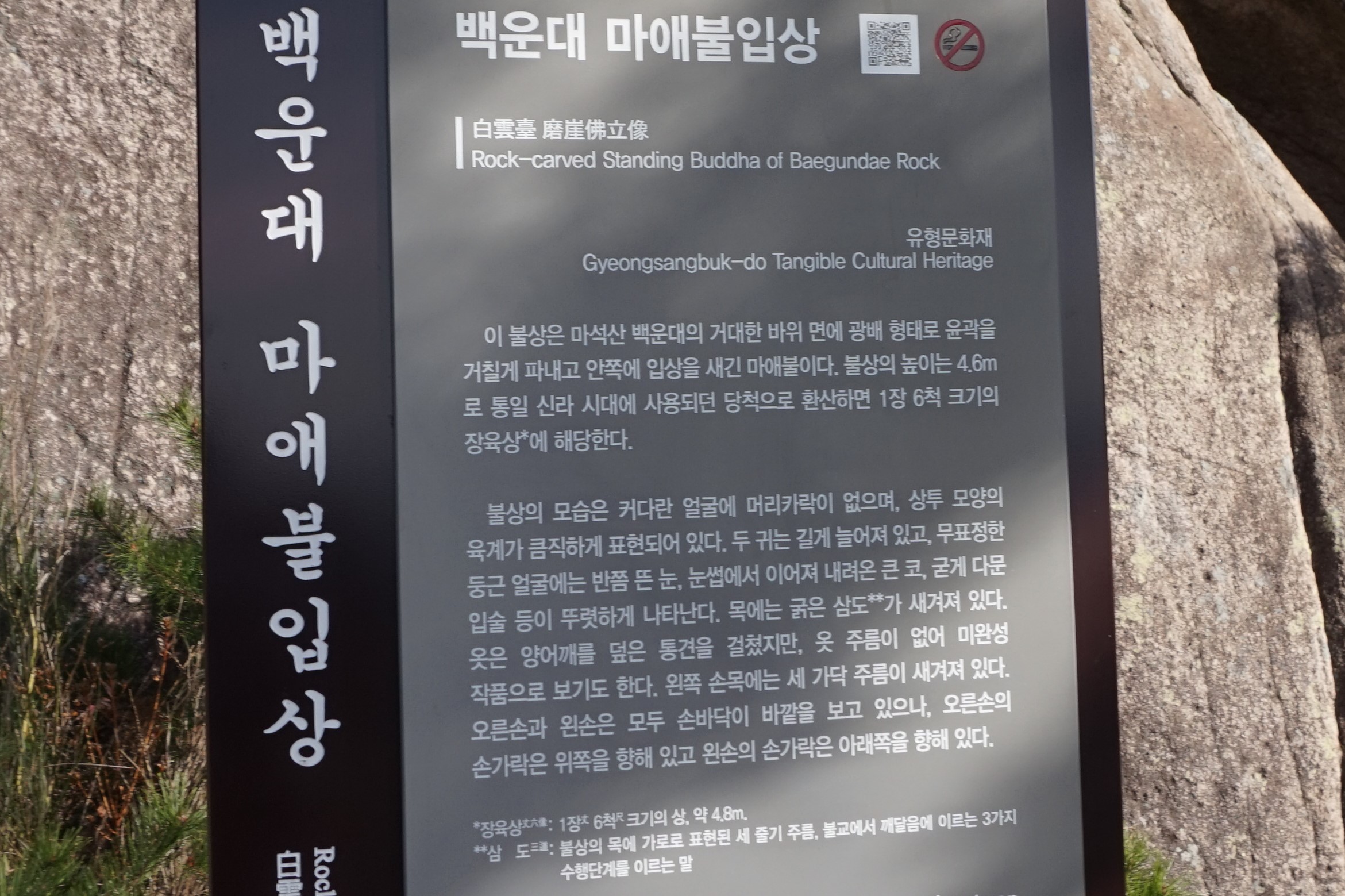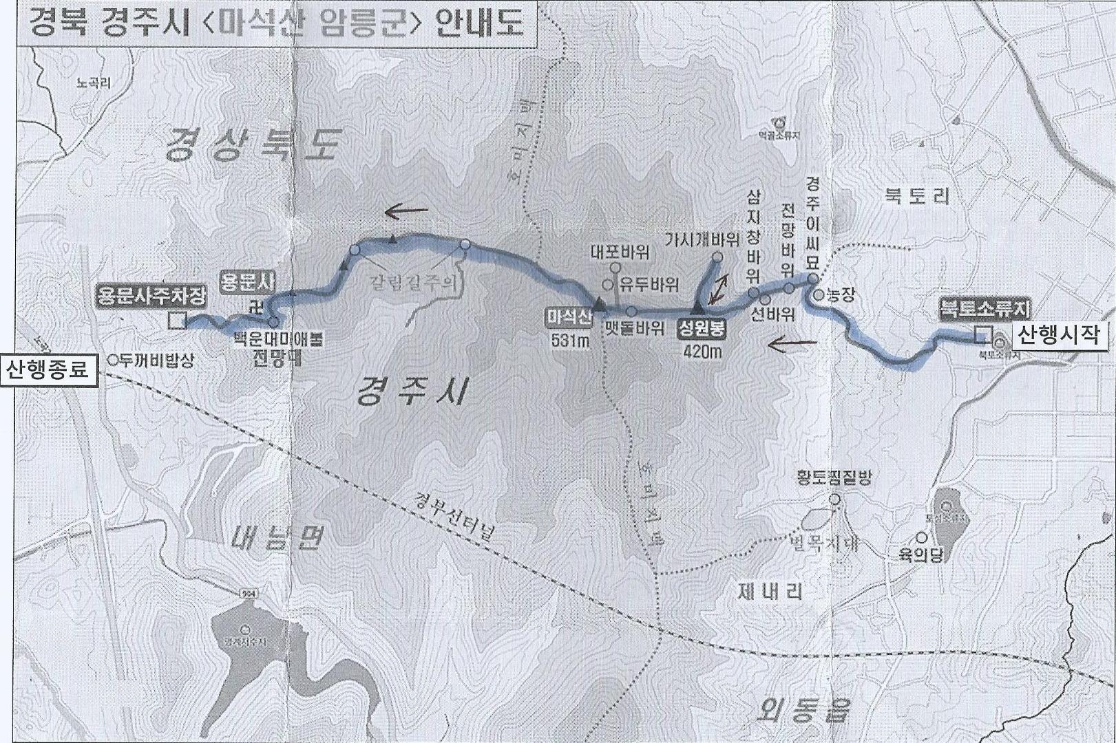 산행코스 : 북토소류지 - 농장 - 전망바위 - 삼지창바위 - 선바위 - 성원봉 - 가시개바위(왕복) - 대포바위 - 맷돌바위 - 마석산 - 갈림길 - 용문사 - 백운대 마애불입상 - 석문 - 두꺼비밥상 (약 7.5키로)