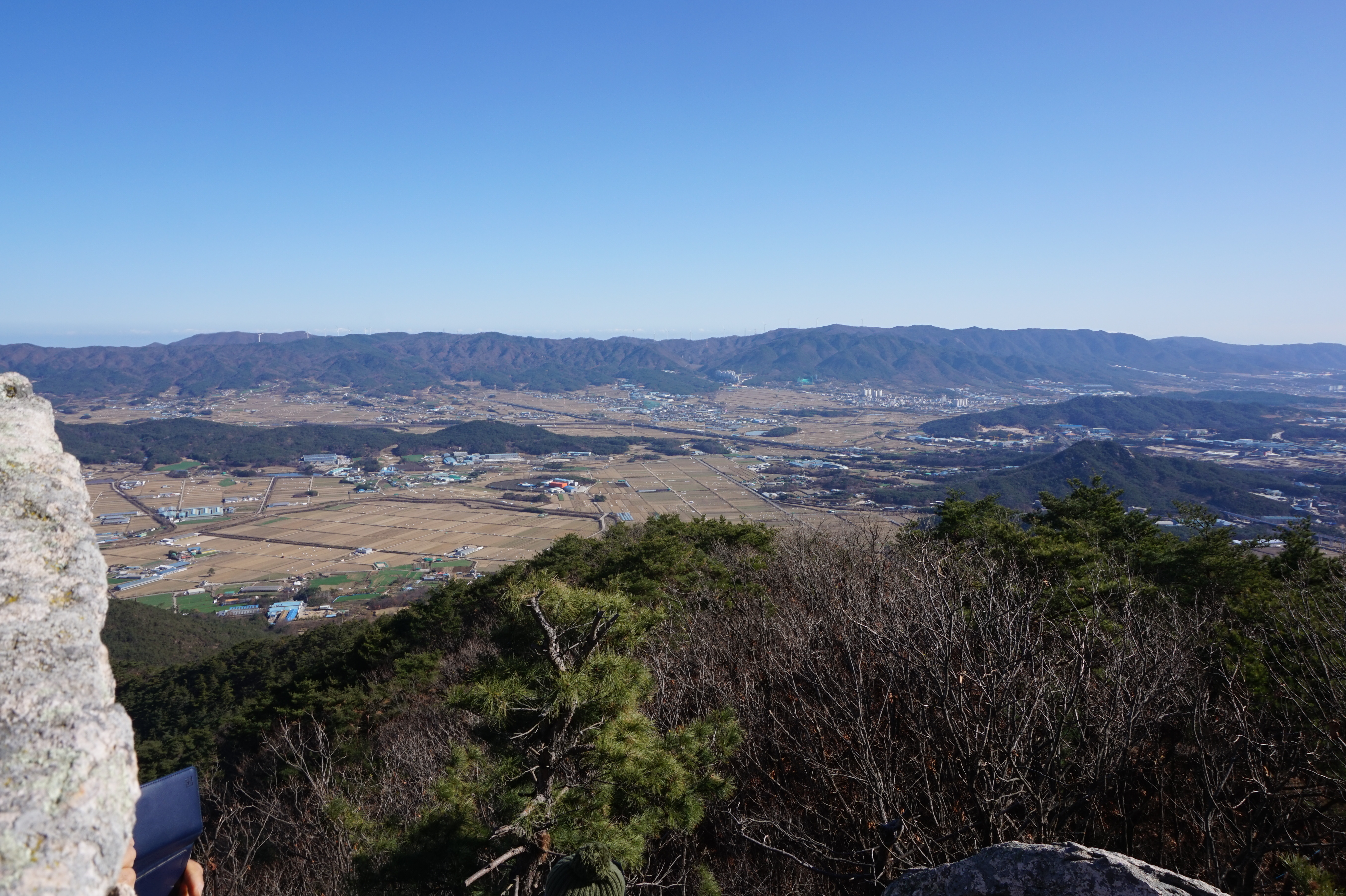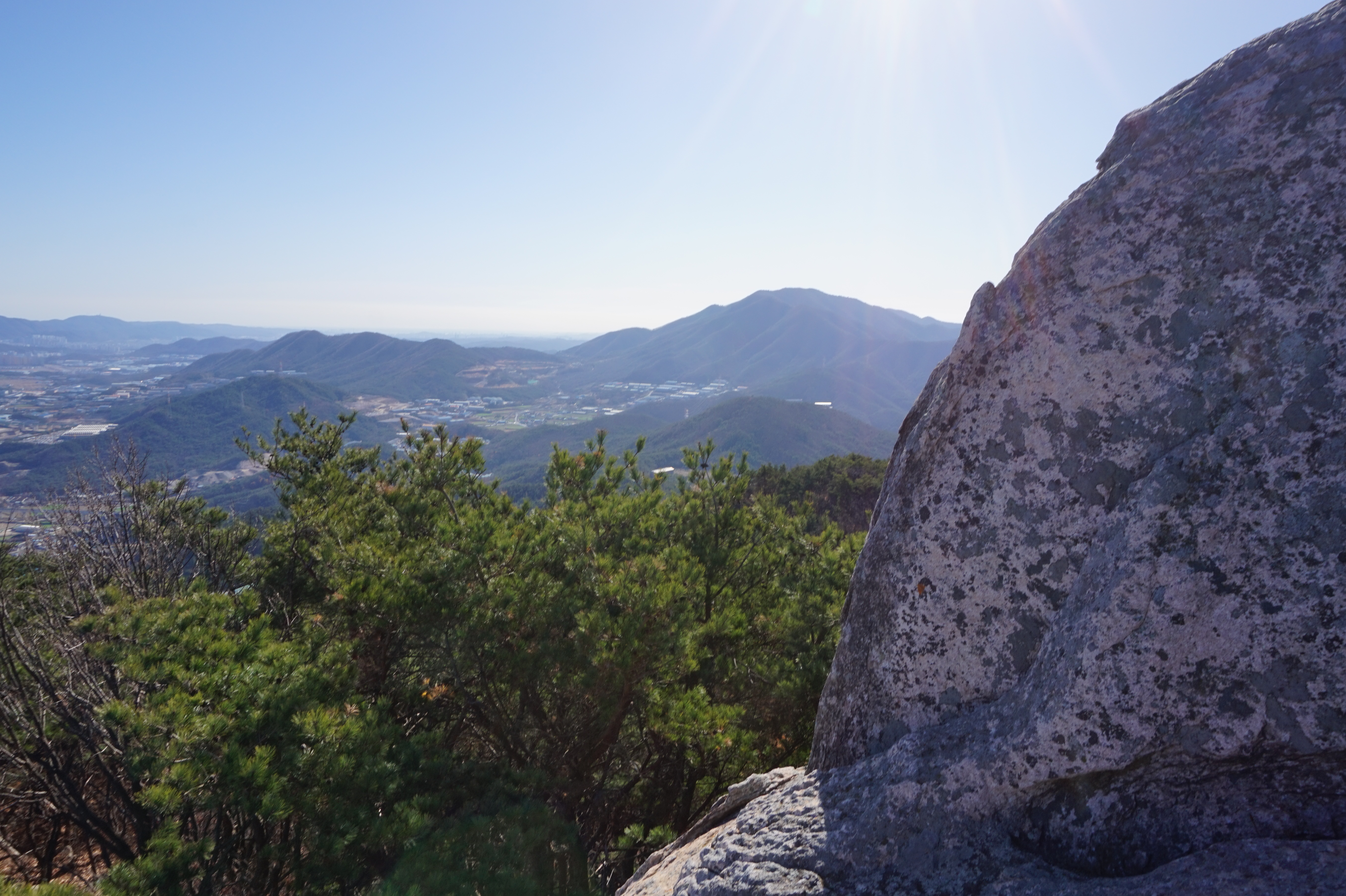 좌측에 경주시 외동읍과 가운데뒤 울산시가지가 보이고 울산 동대산(11시)과 가운데뒤 통신안테나 눈에띄는 울산 무량산이 보입니다