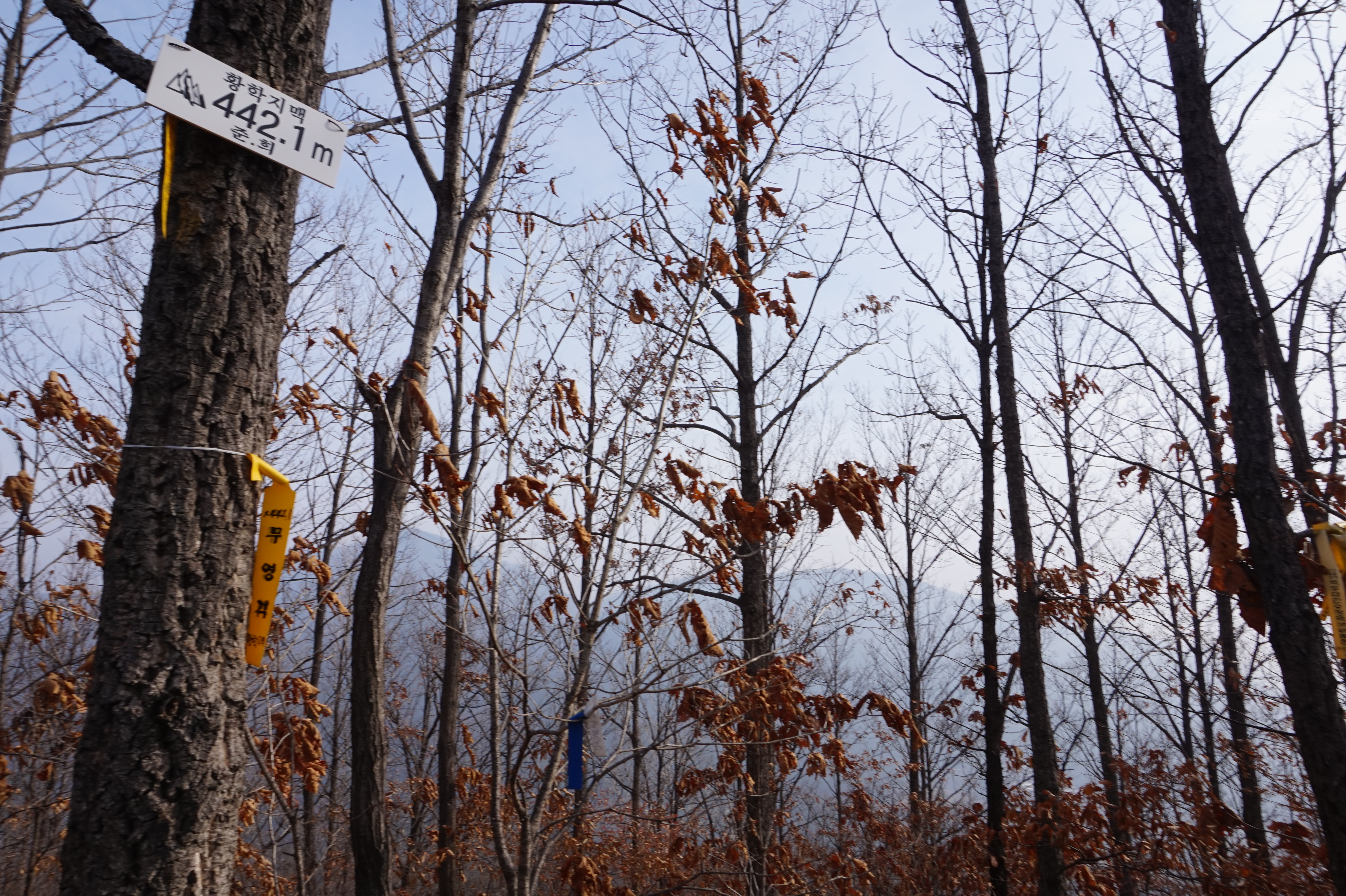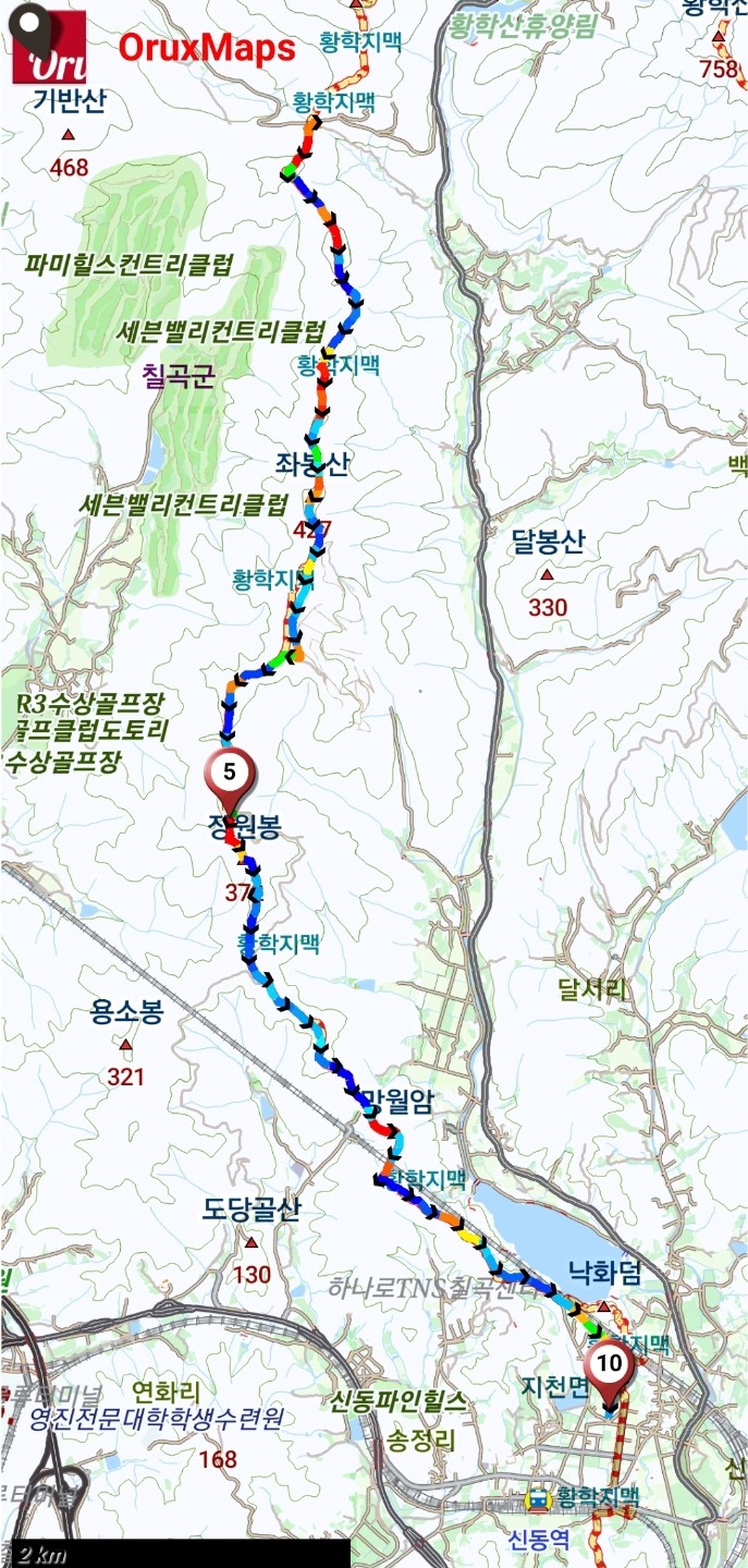 산행코스 : 요술의고개 - 한골재 - 442.1봉 - 좌봉산 - 조양공원 - 364.9봉 - 임도 - 장원봉 - 삼거리 - 신리공단 - 지천면사무소 (약 10.5키로)