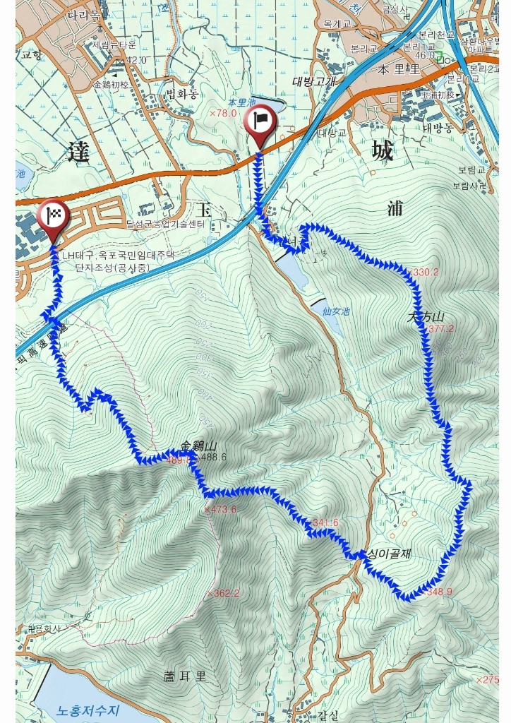 산행코스 : 선녀곡앞(옥포) - 광주대구고속도로 토끼굴 - 대방산 - 선녀봉 - 싱이골재 - 삼거리 - 금계산 - 갈림길 - 이철견신도비 - 강림교 (약 7.6키로)