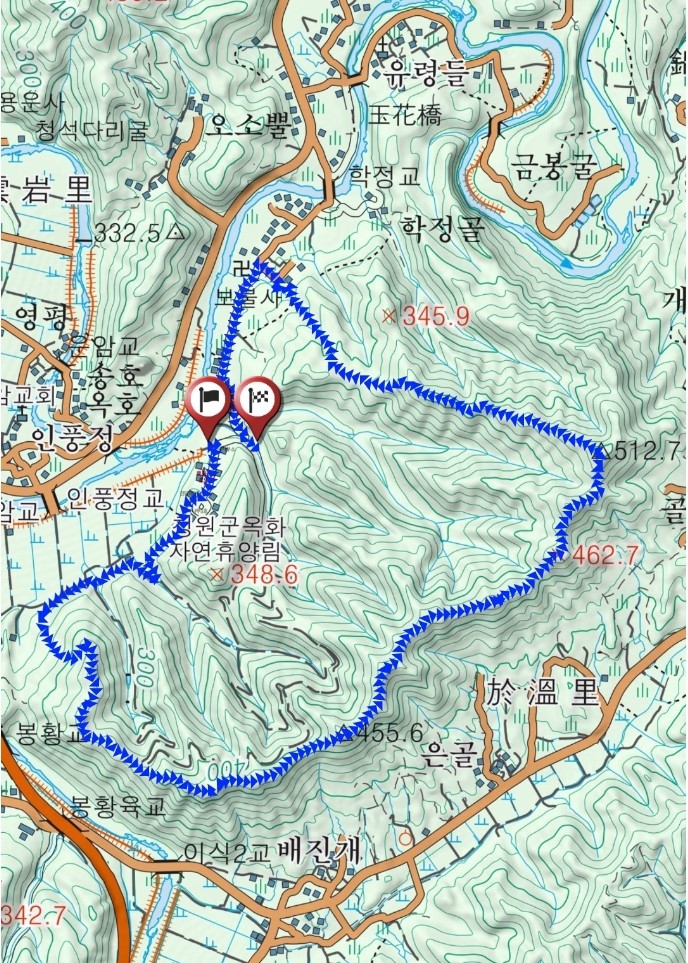 산행코스 : 옥화자연휴양림 - 임도- 애매한길 - 능선 - 배진개봉 - 정자 - 462.7봉 - 옥화봉 - 임도- 운암옥화길 - 옥화자연휴양림 (약 8.6키로)