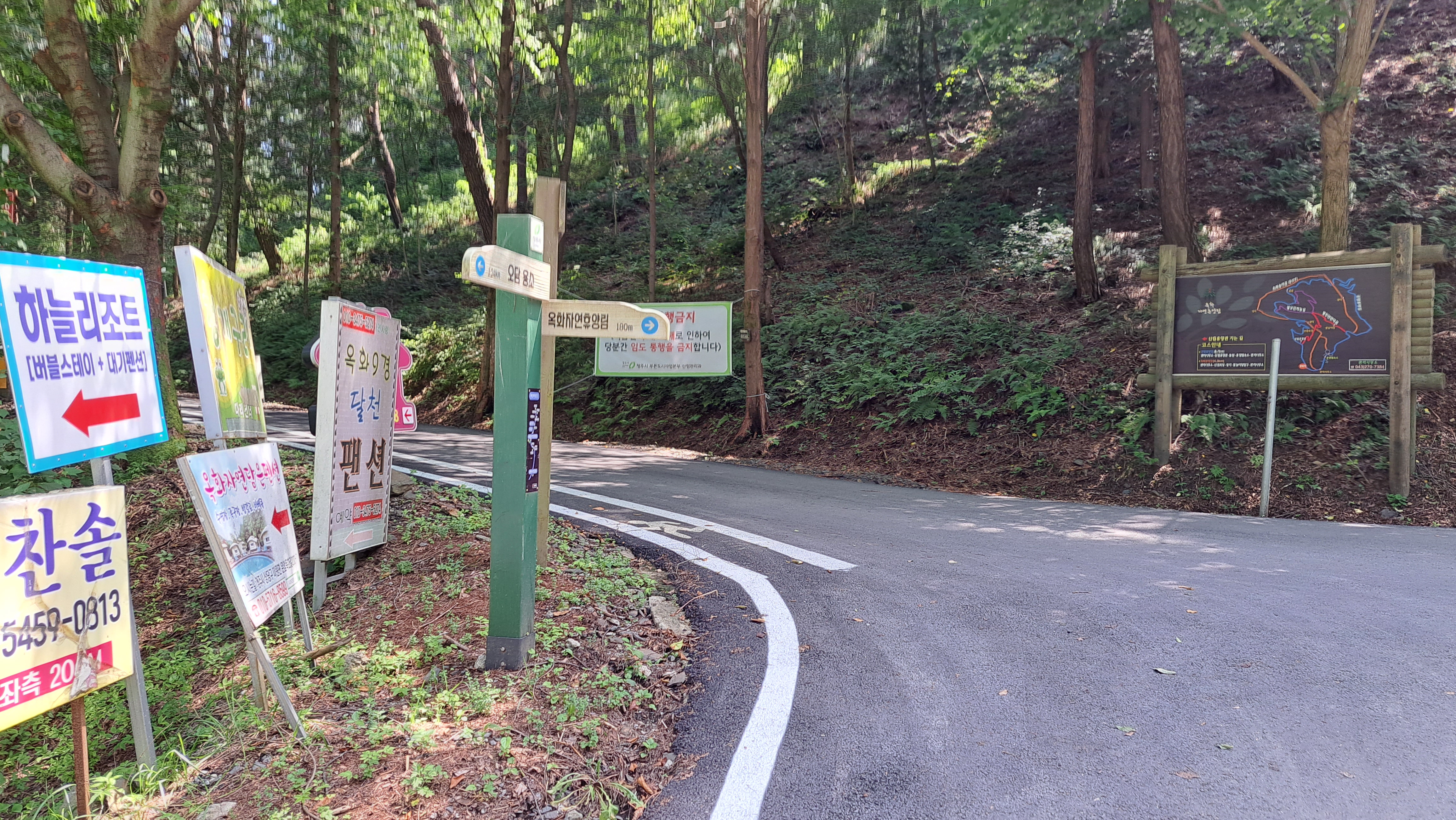임도로 내려왔고 다내려와 약간의 혼선이 있었지만, 운암옥화길을 만나는 정면에 있는 이정표 (휴양림까지 약1.01키로)