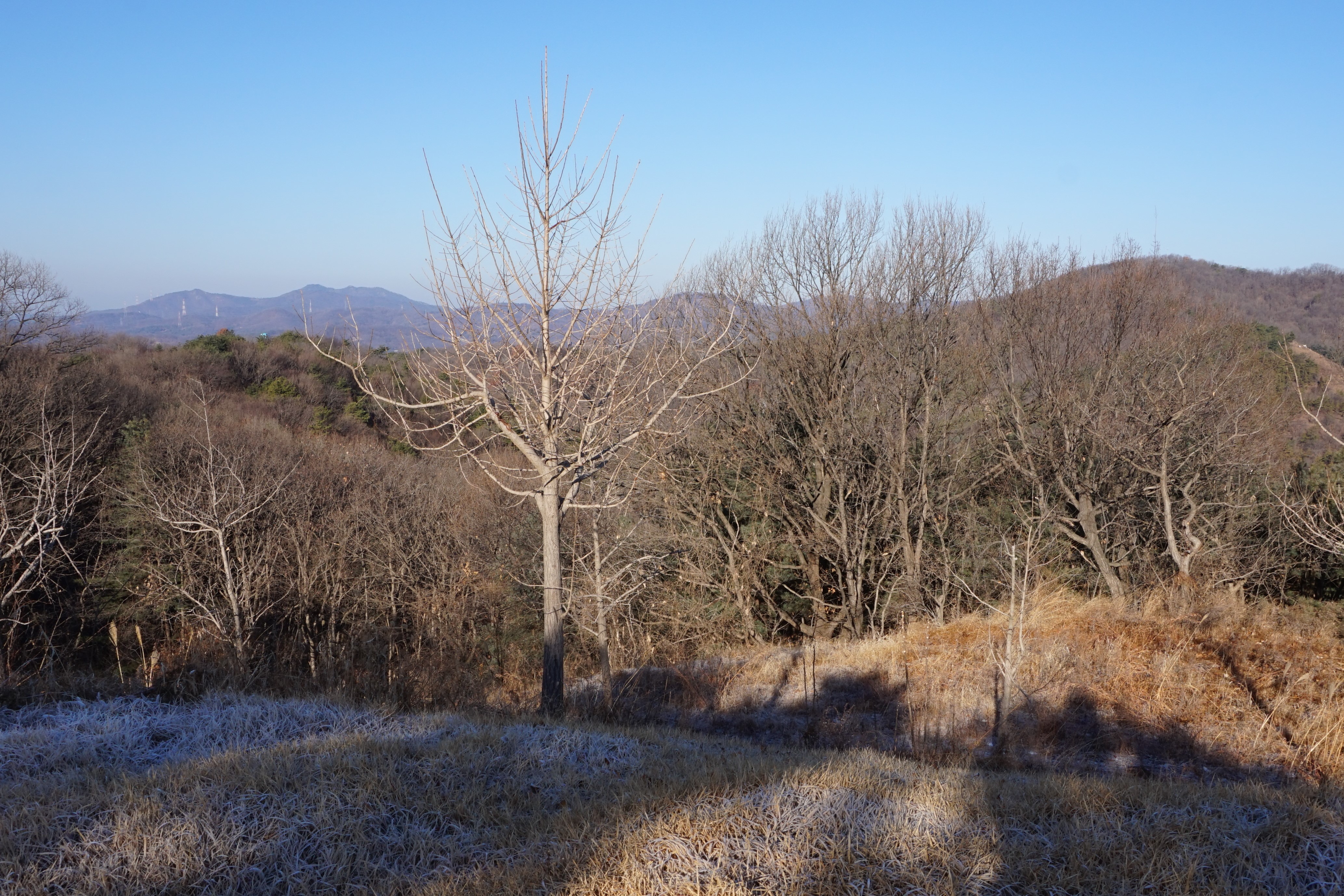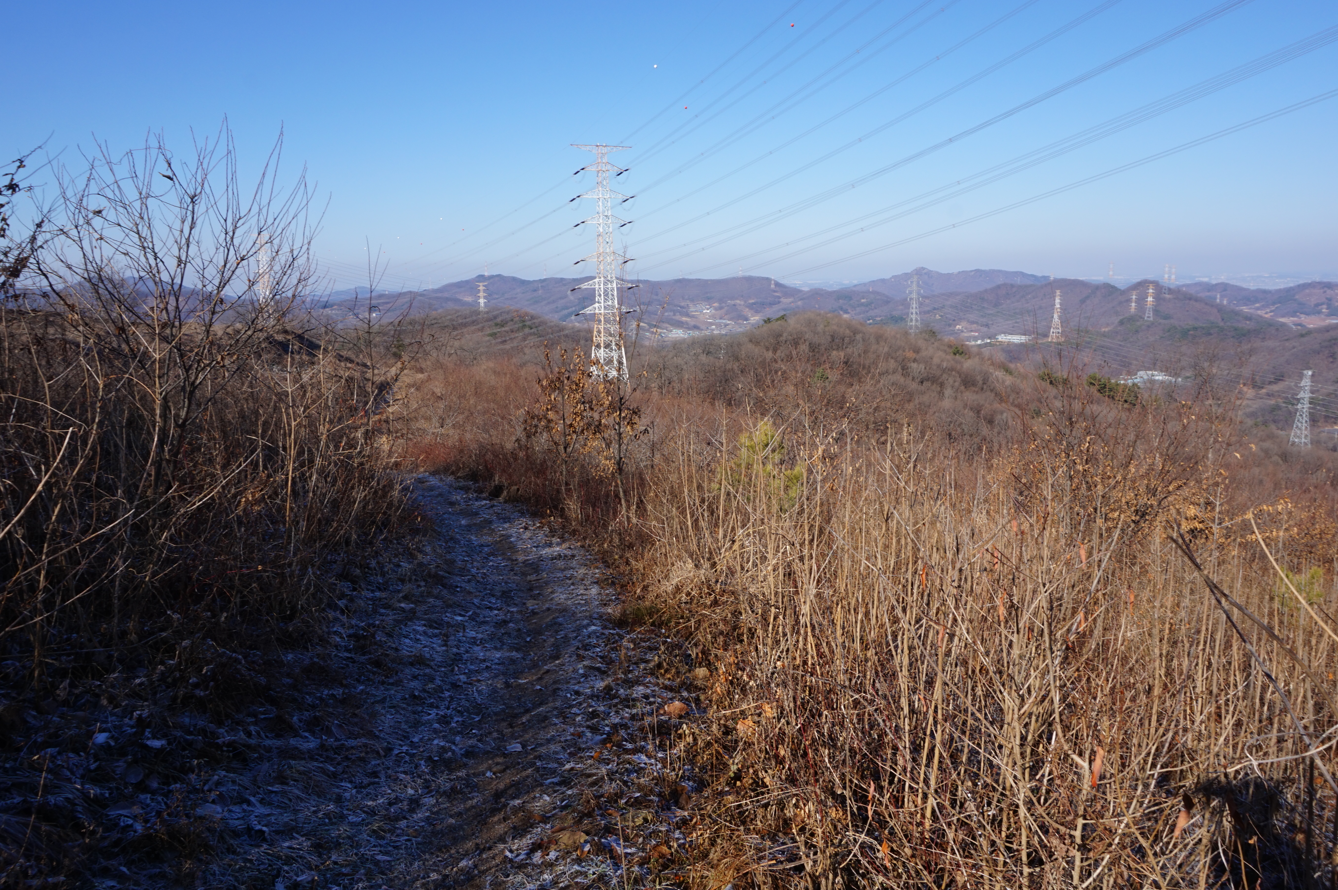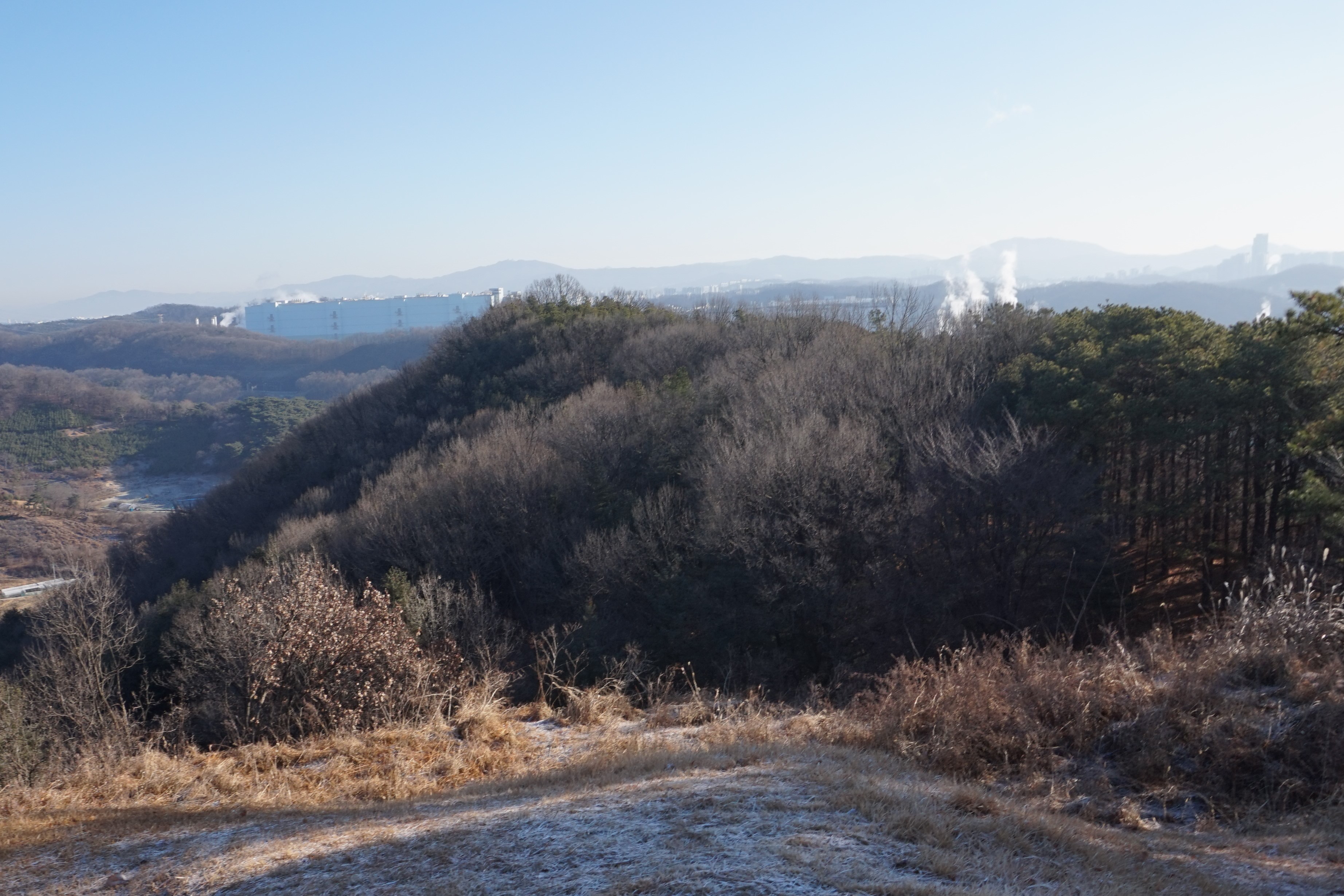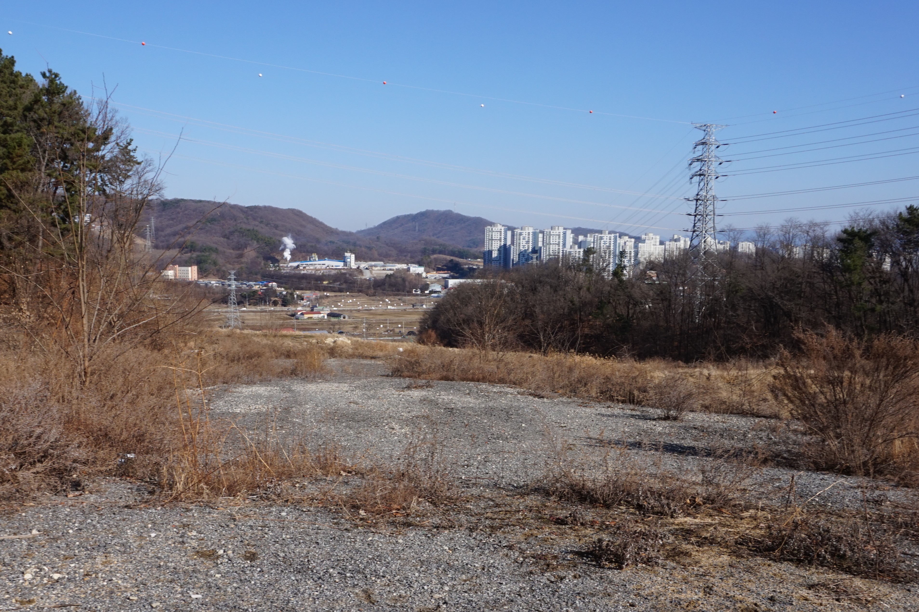 더샵레이크씨티 아파트와 가운데뒤 용와산이 보이고 동절기니까 앞에 보이는 음봉로 방향으로 직진합니다