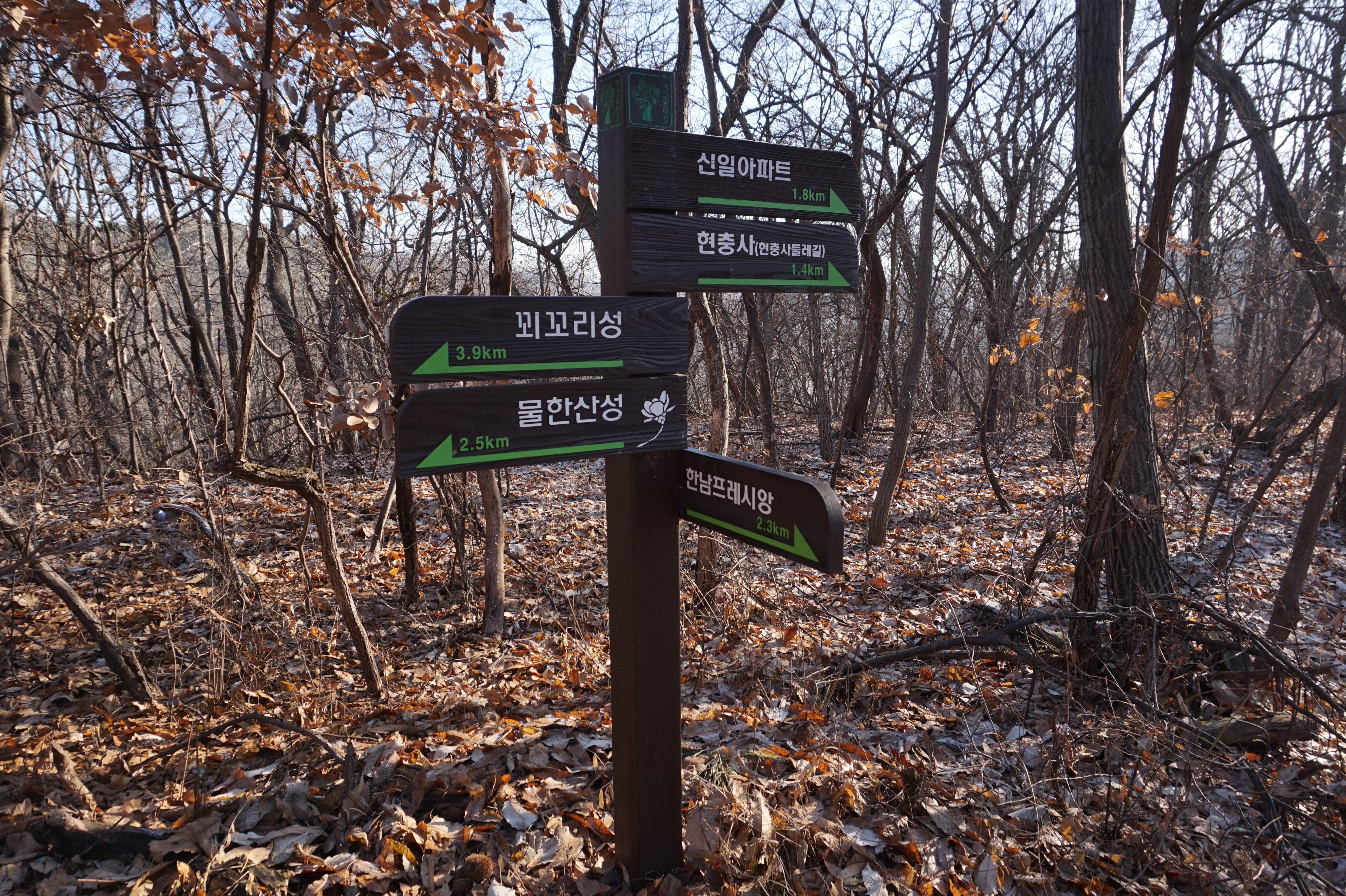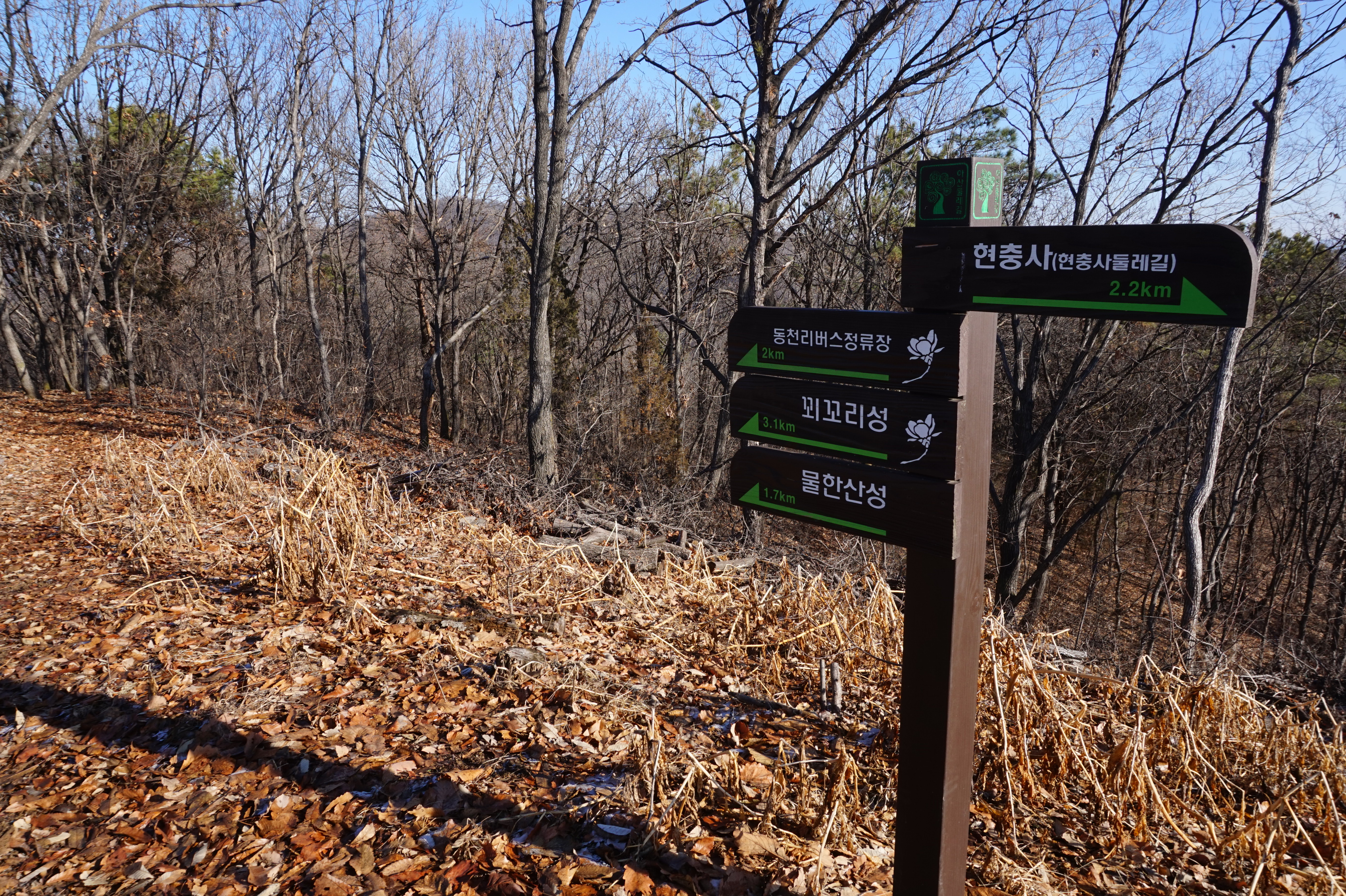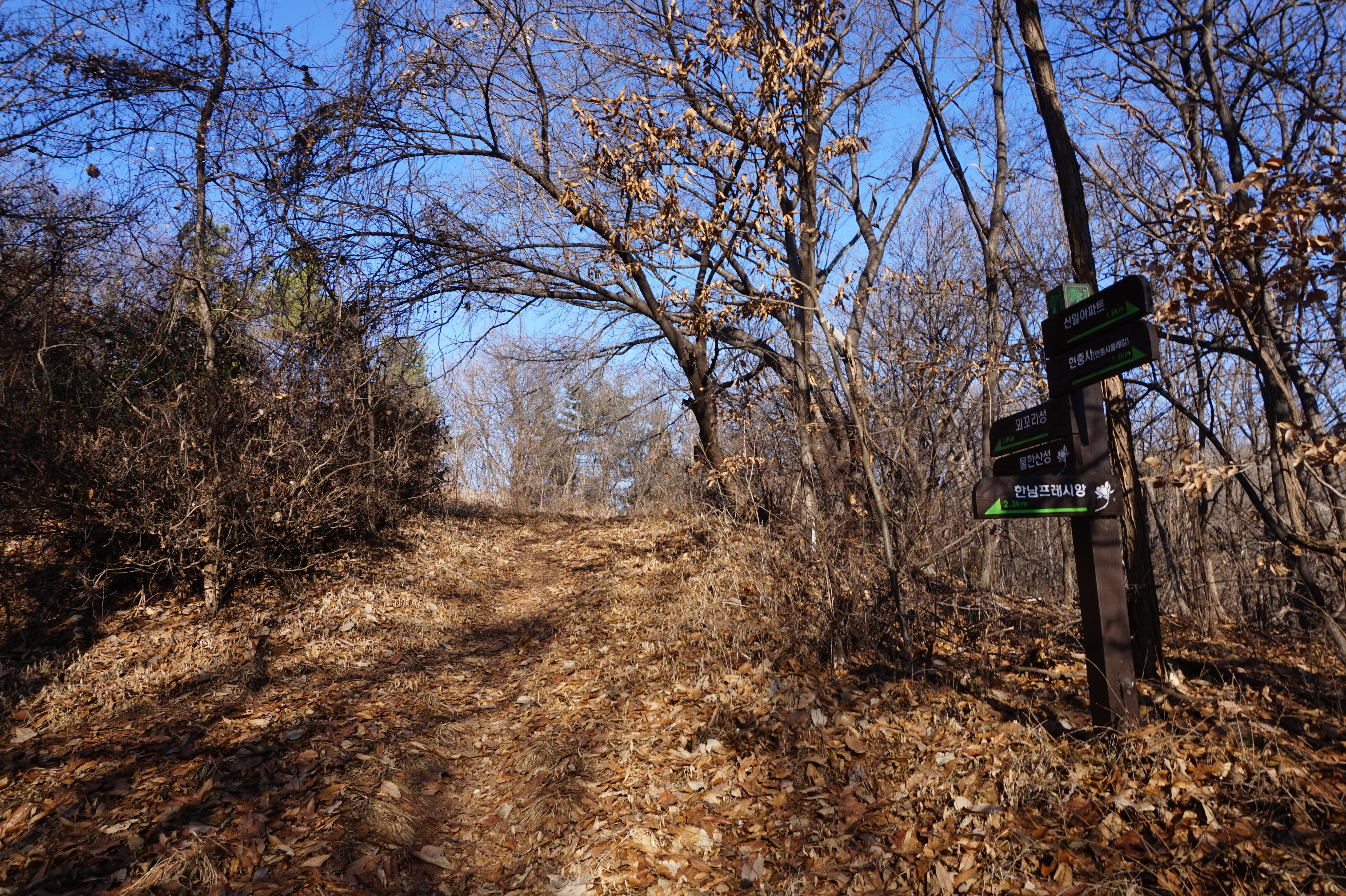 방현동길을 만나는데 우측에 보이는 이정표를 따라 직진하다가 바로 우측 산길로 들어서고