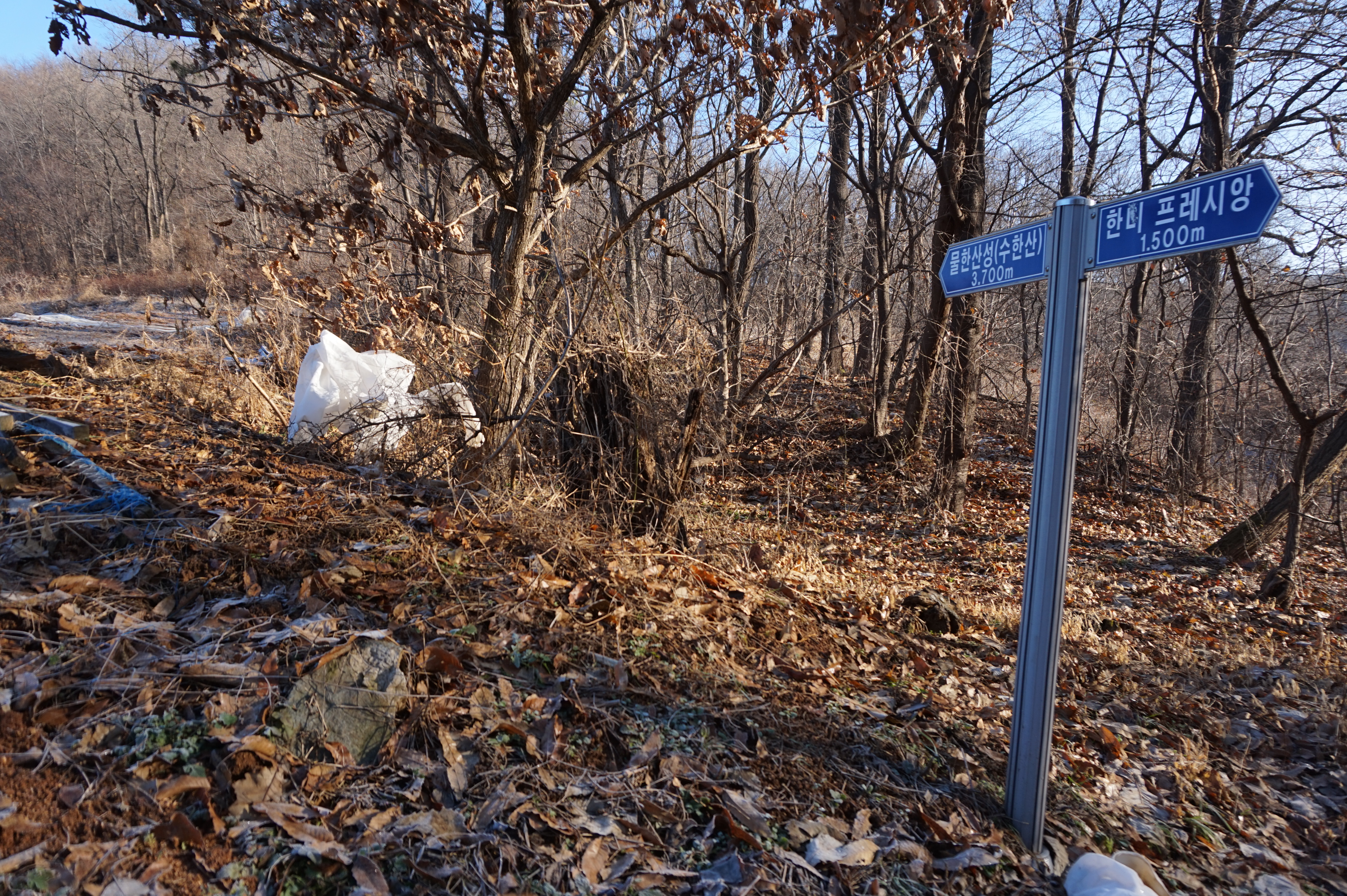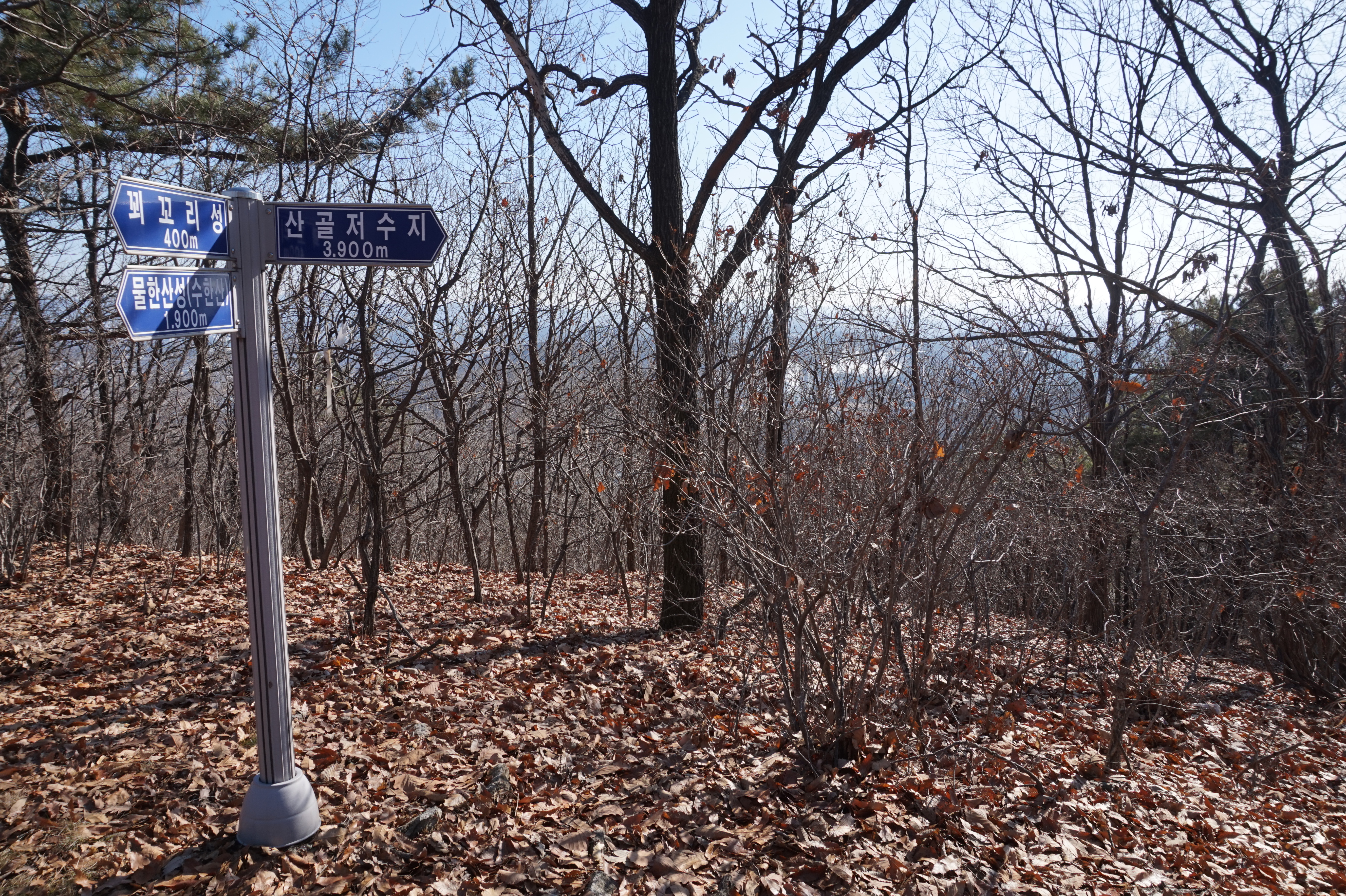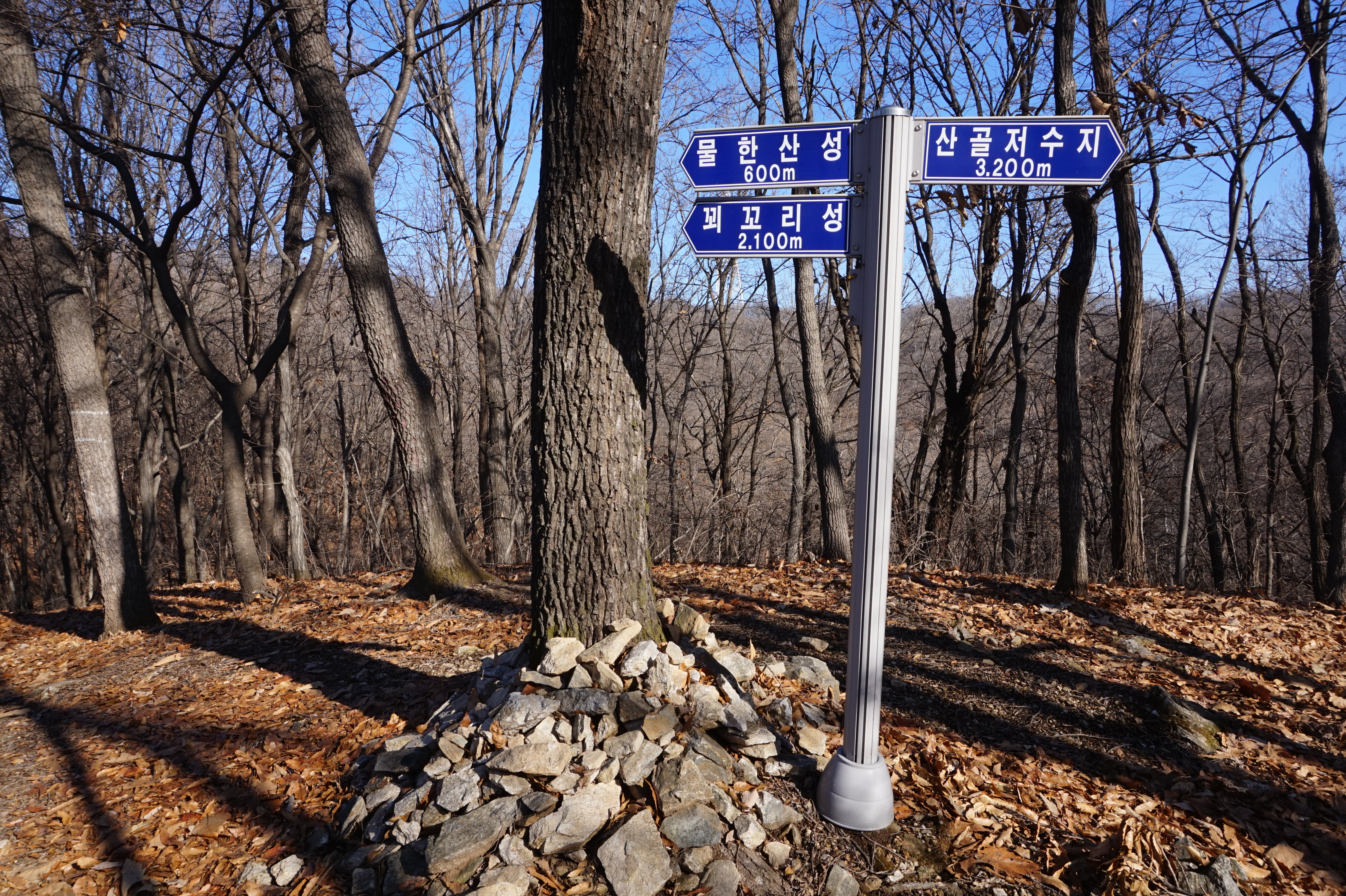 방현동길을 만나는데 우측에 보이는 이정표를 따라 직진하다가 바로 우측 산길로 들어서고