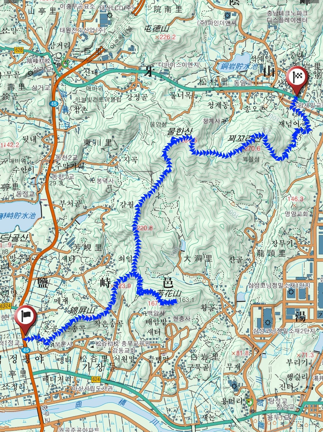 산행코스 : 한남프레시앙아파트 정류장 - 금병산 - 임도 - 삼거리 - 방화산 왕복 - 220.8봉 - 물한산 - 꾀꼬리산 - 동암리 (약 11.8키로)