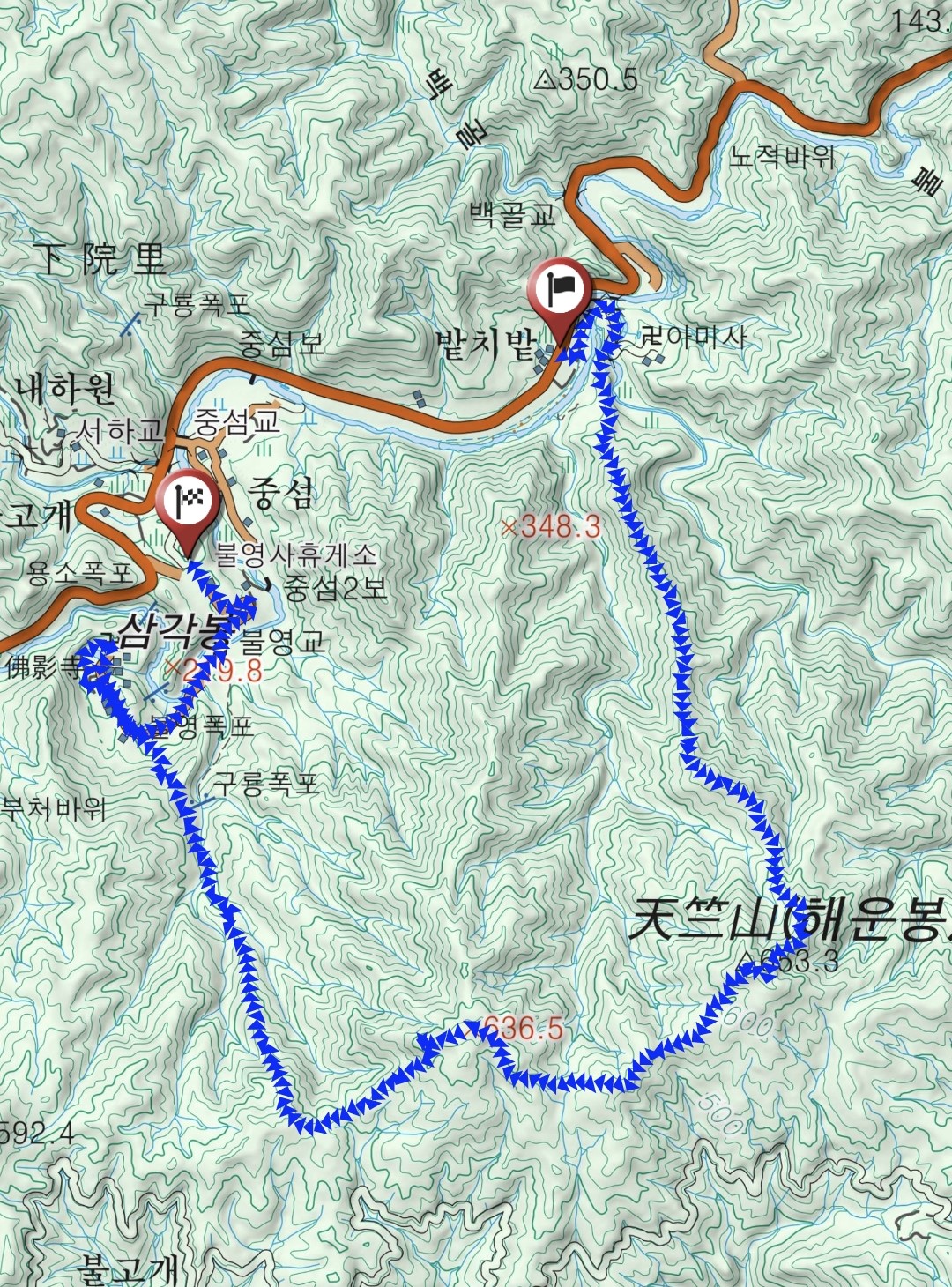 산행코스 : 하원리 버스정류장 - 천축산(해운봉) - 636.5봉 - 북바위봉 - 조망바위 - 550봉 - 불영사길 - 불영사(왕복) - 불영사 주차장 (약 9.1키로)