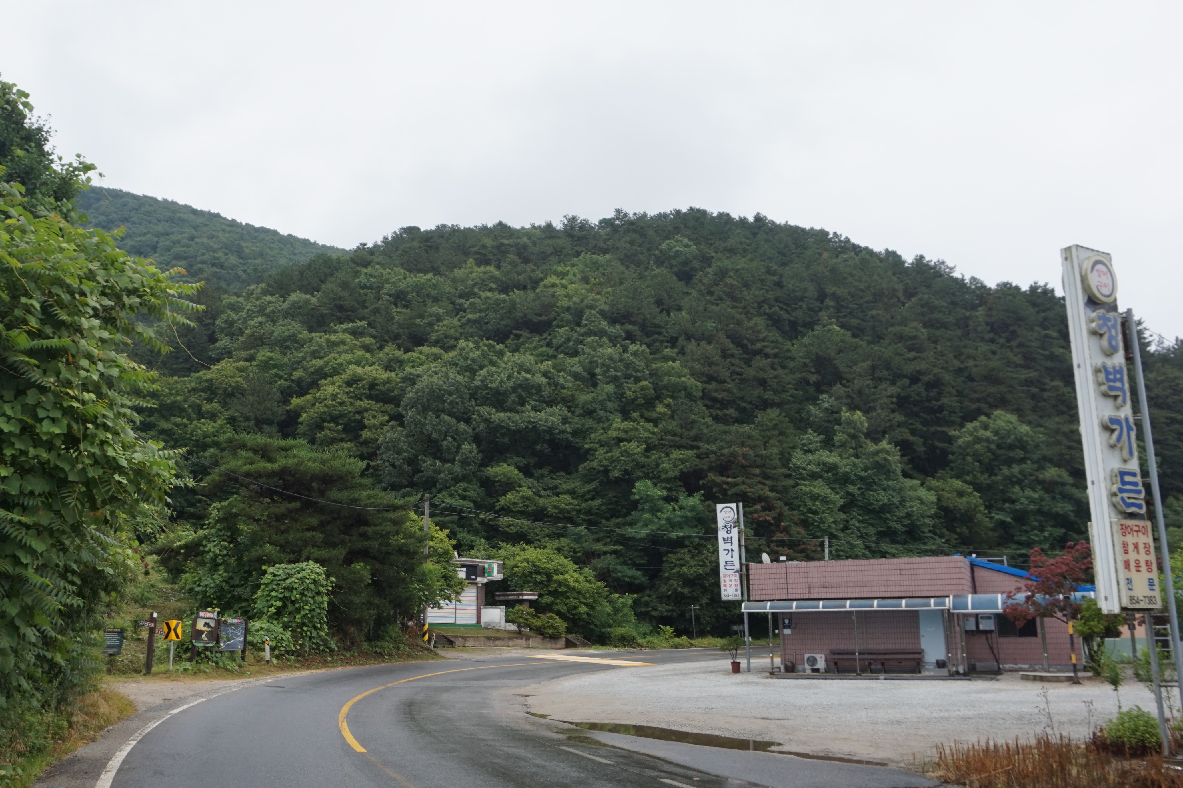 옥룡동 행정복지센터 길건너 버스정류장에서 09:04분에 승차한 302버스(300, 302버스가 매시 이시간에 있음)로 10분만에 도착한 마암리정류장에서 들머리로 이동중 앞에 진행할 진날산과 그우뒤에 청벽산 정상부가 살짝 보이고
