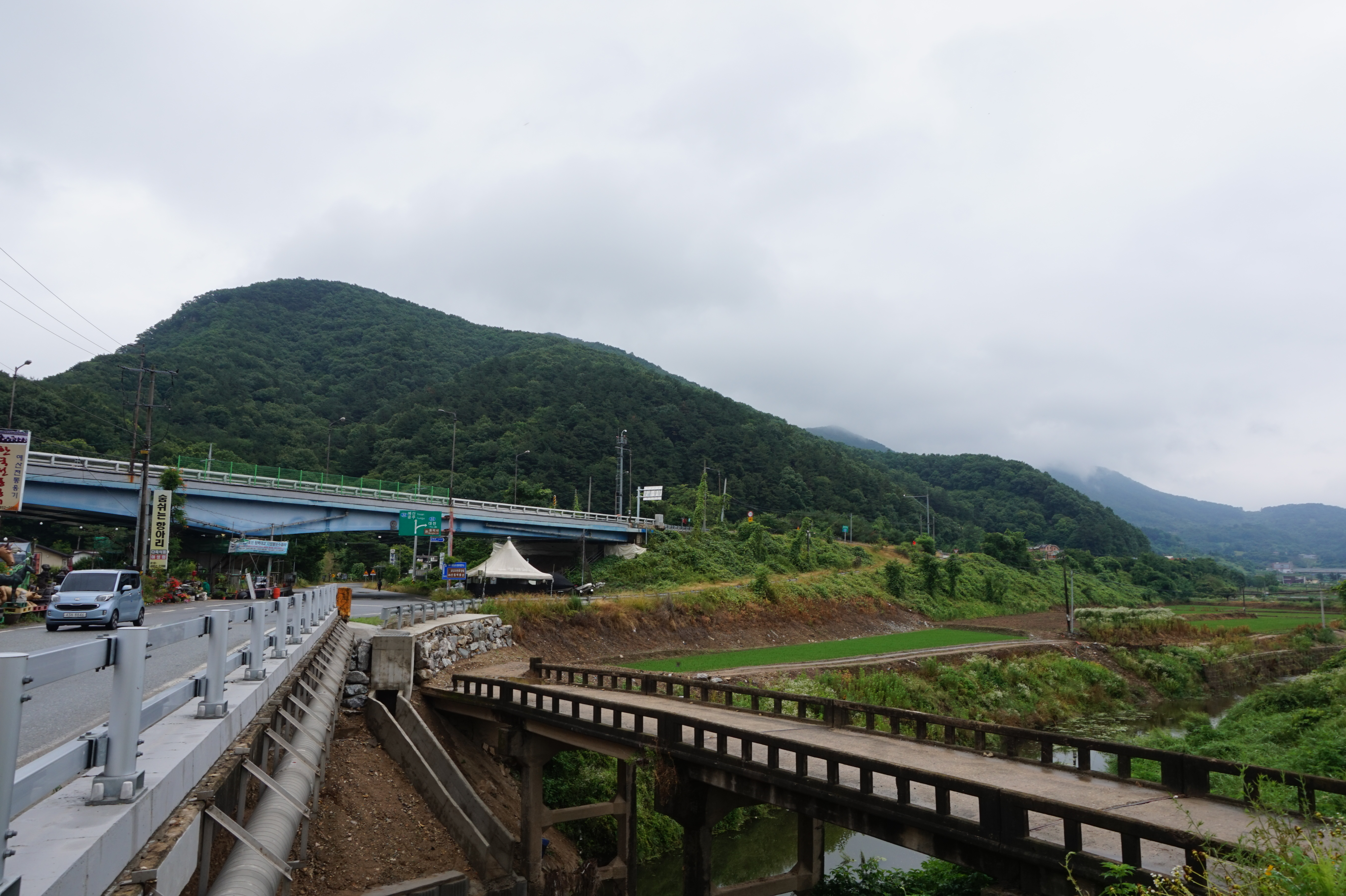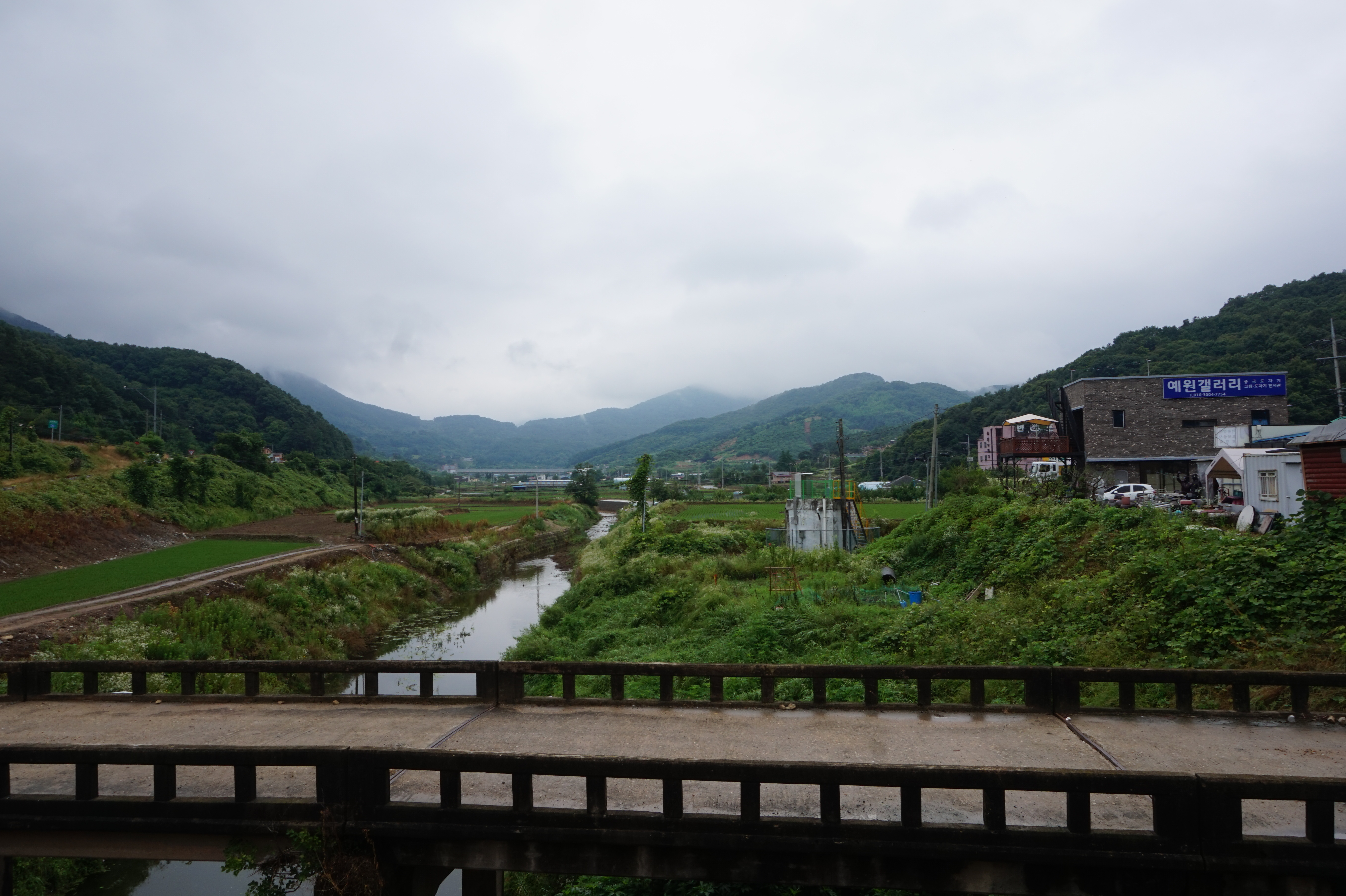 청벽교 건너며 우측에 보이는, 좌뒤에 구름에 덮힌 국사봉-마티고개-수월산(가운데)이 될듯하고 아래는 마암천