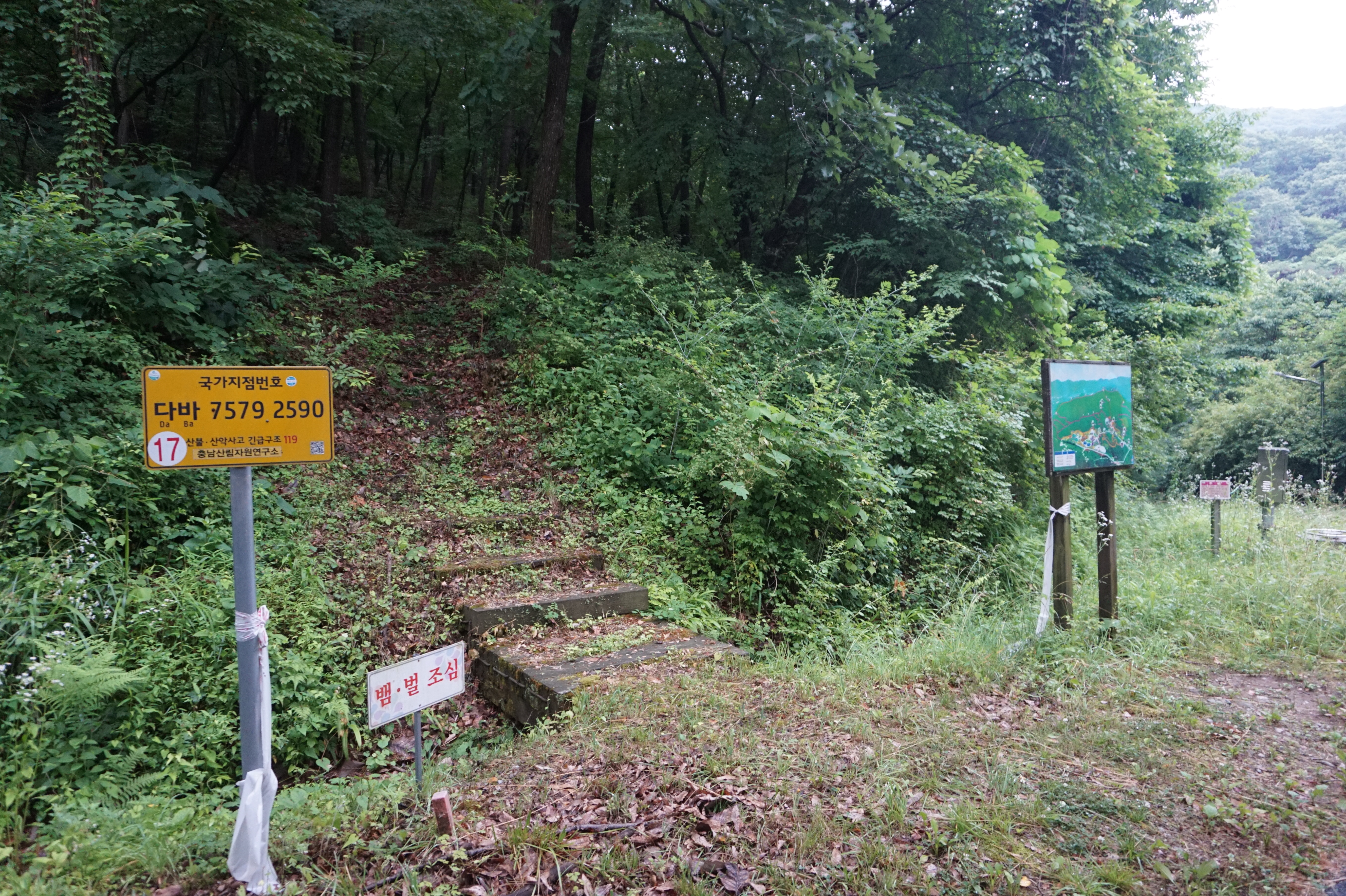 위 장소에서 임도 만나고 바로 좌측으로 오래된 나무계단길이 보이고 임도따라 진행하고