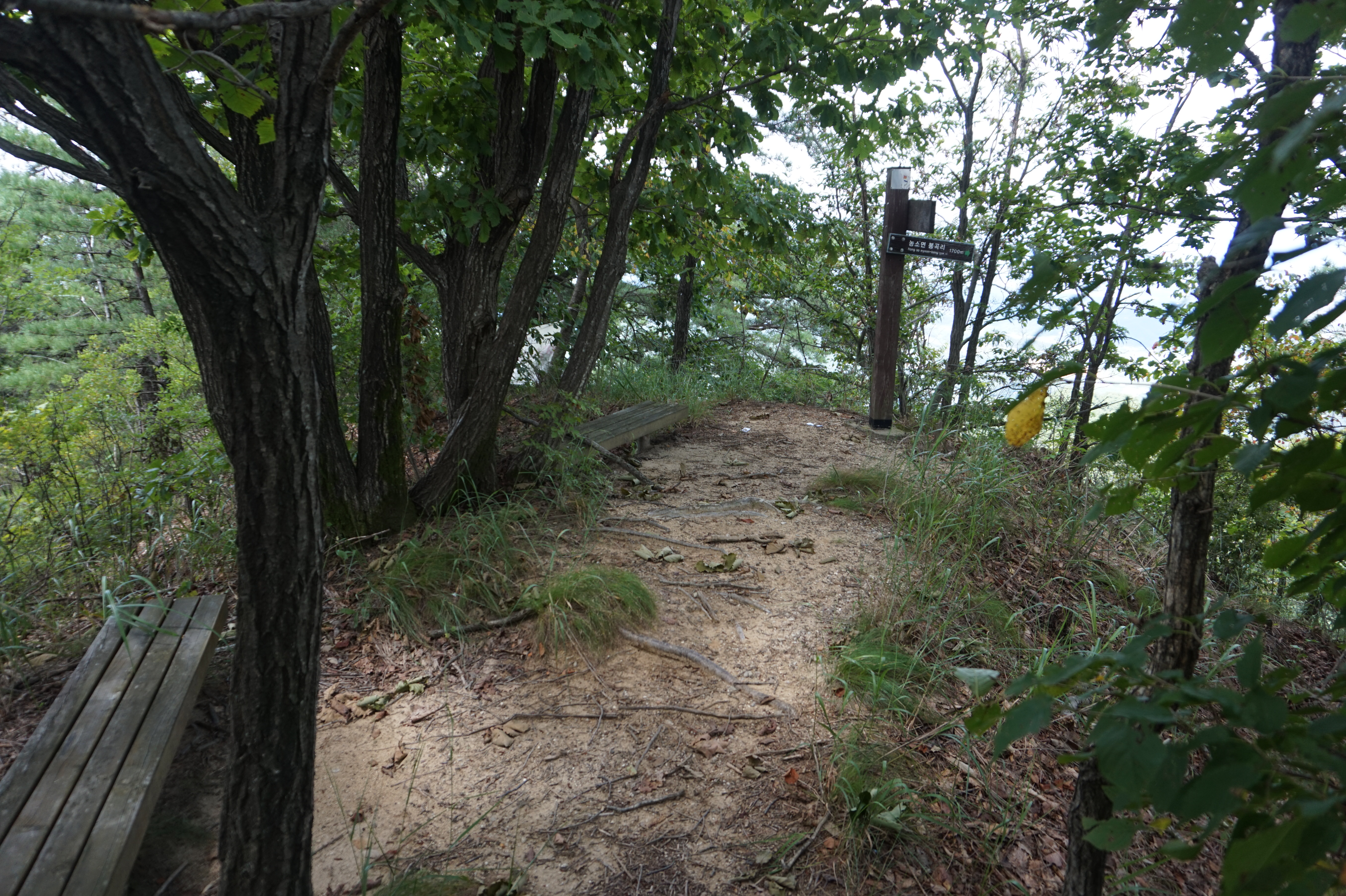 정상석옆에 이정표 / 앞에 밴치에서 간식및 휴식시간을 10여분 갖고 하산합니다