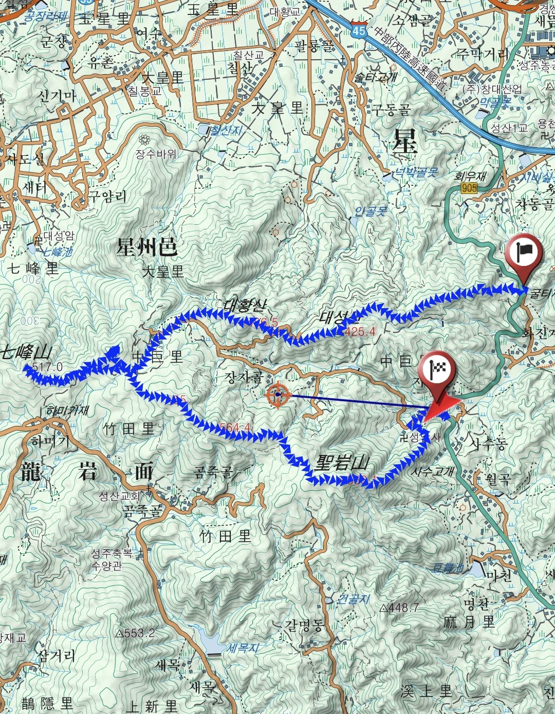 산행코스 : 굴티재 - 대성산 - 대황산 - 임도삼거리 - 칠봉산(왕복) - 516봉 - 임도삼거리 - 산불감시초소(555봉) - 성암산 - 중거리 경로당앞 (약 11.3키로)