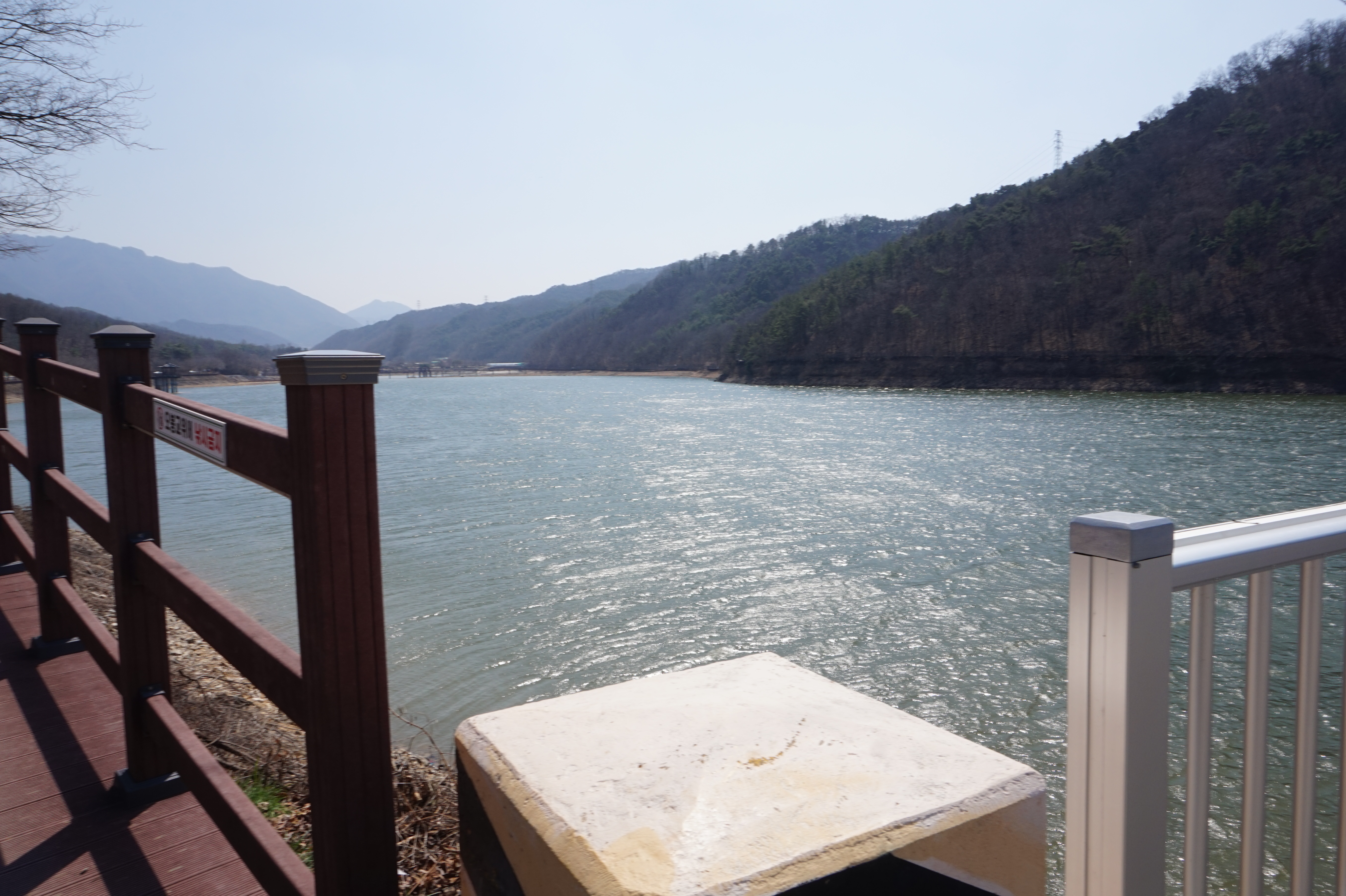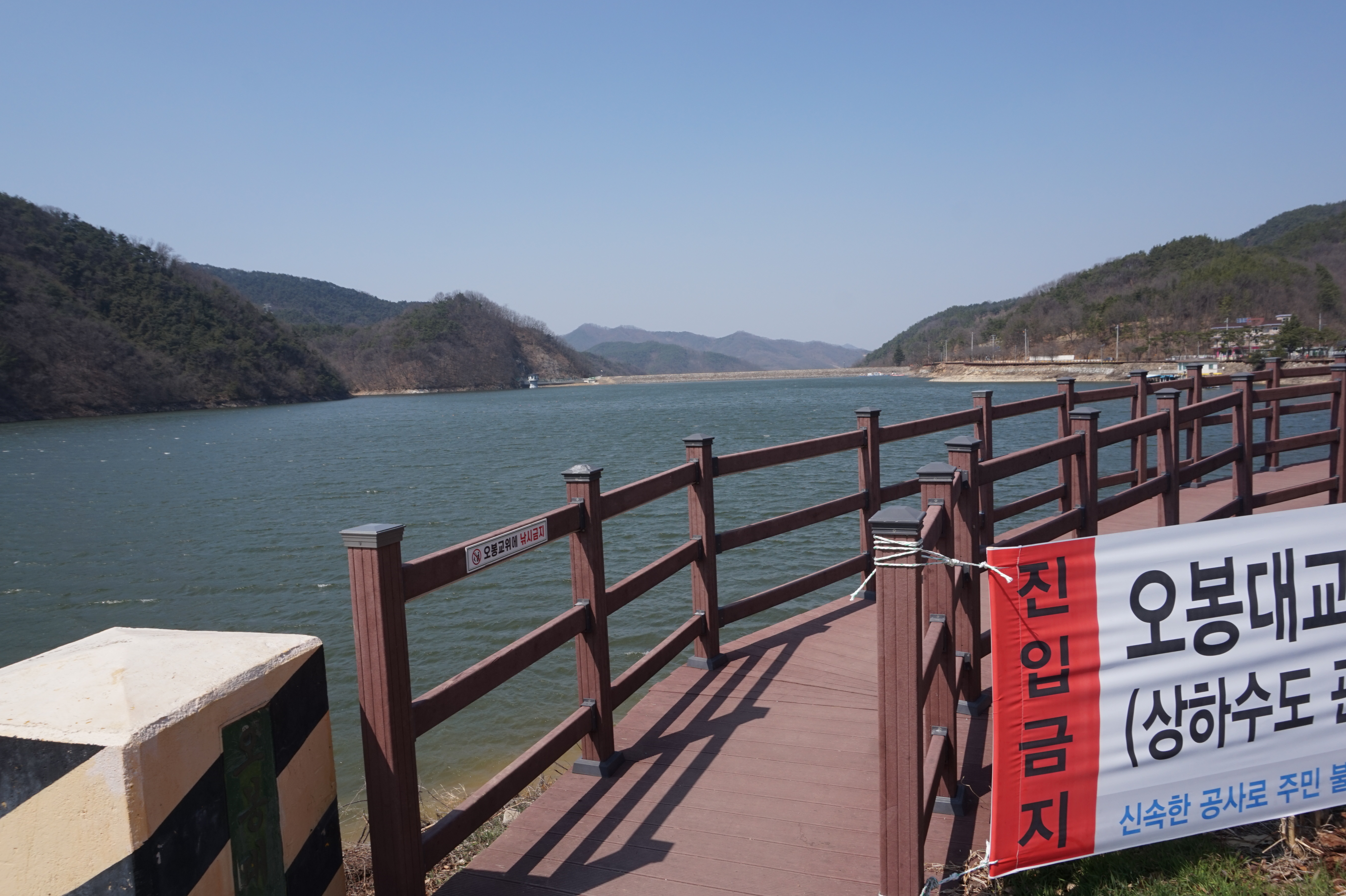 좌측이 오봉대교, 앞에 오봉저수지 제방이 보이고