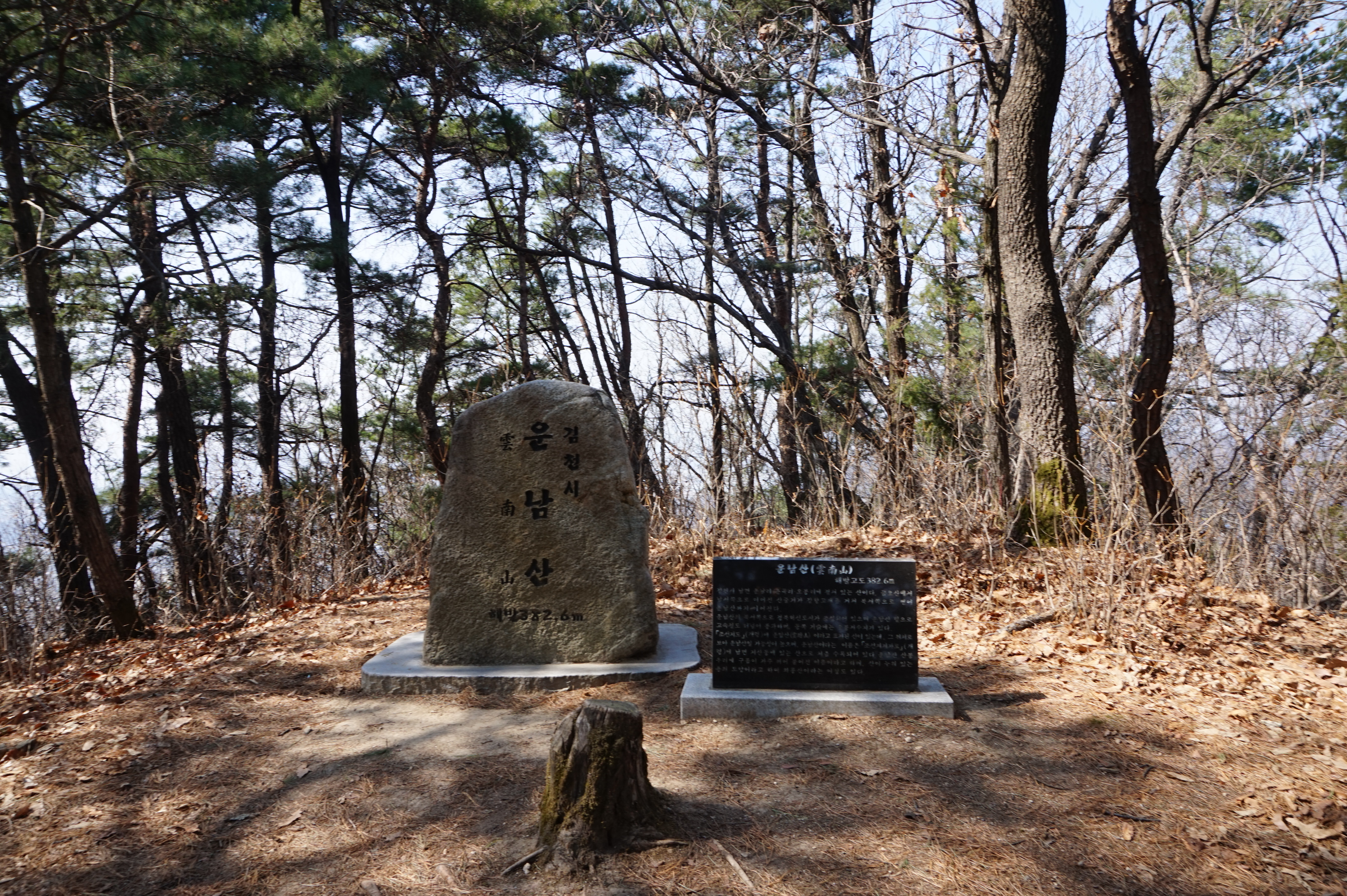 (14:28) / 오봉대교에서 지루할정도로 약간씩 오르내리며 이정표상 3.5키로이상 진행후 만나는 운남산 정상석