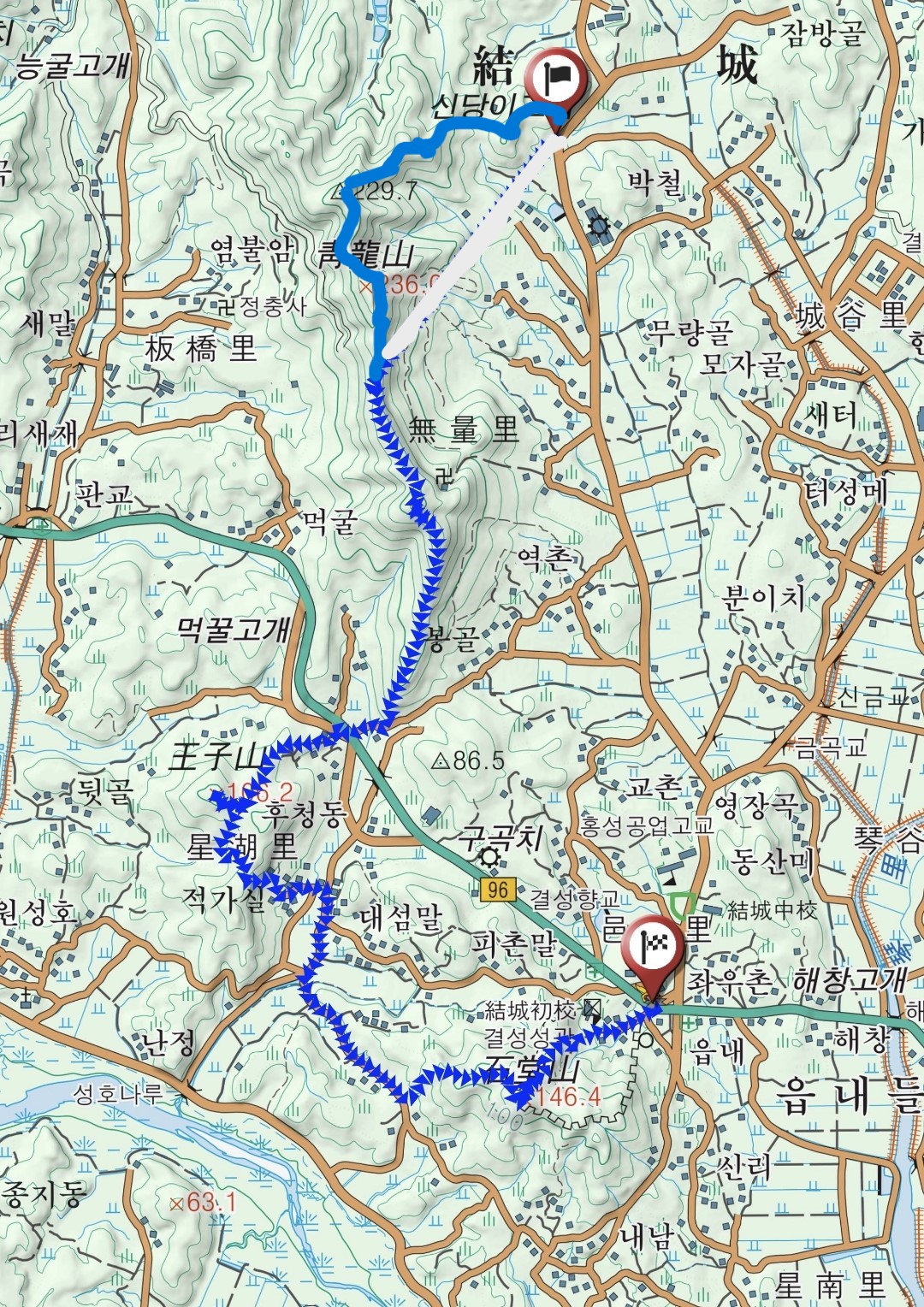 **절전모드를 중도 끄는 바람에 들머리부터 직선으로 표기된 직선 경로는 흰색으로 지우고 나름 경로를 그렸고