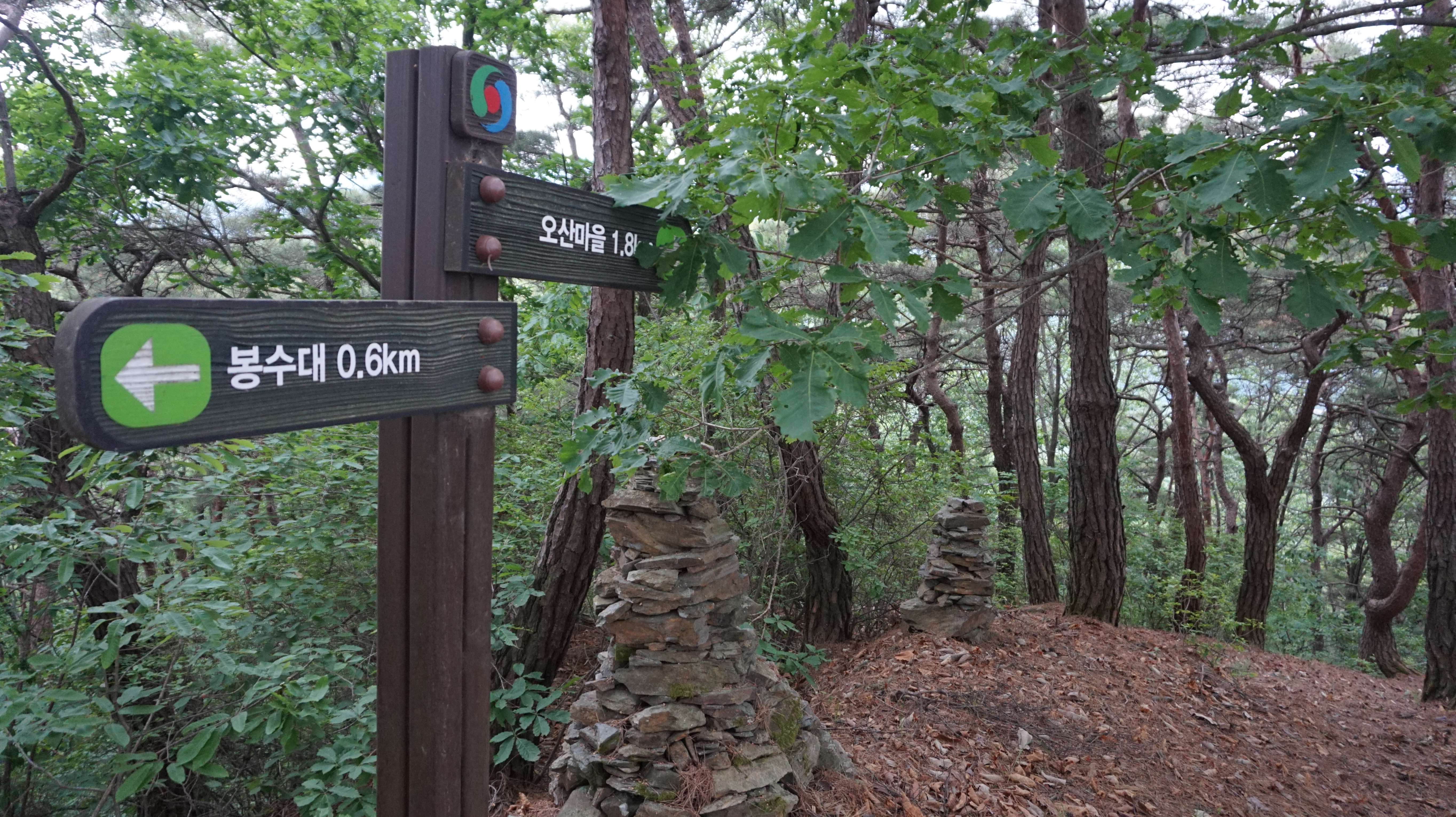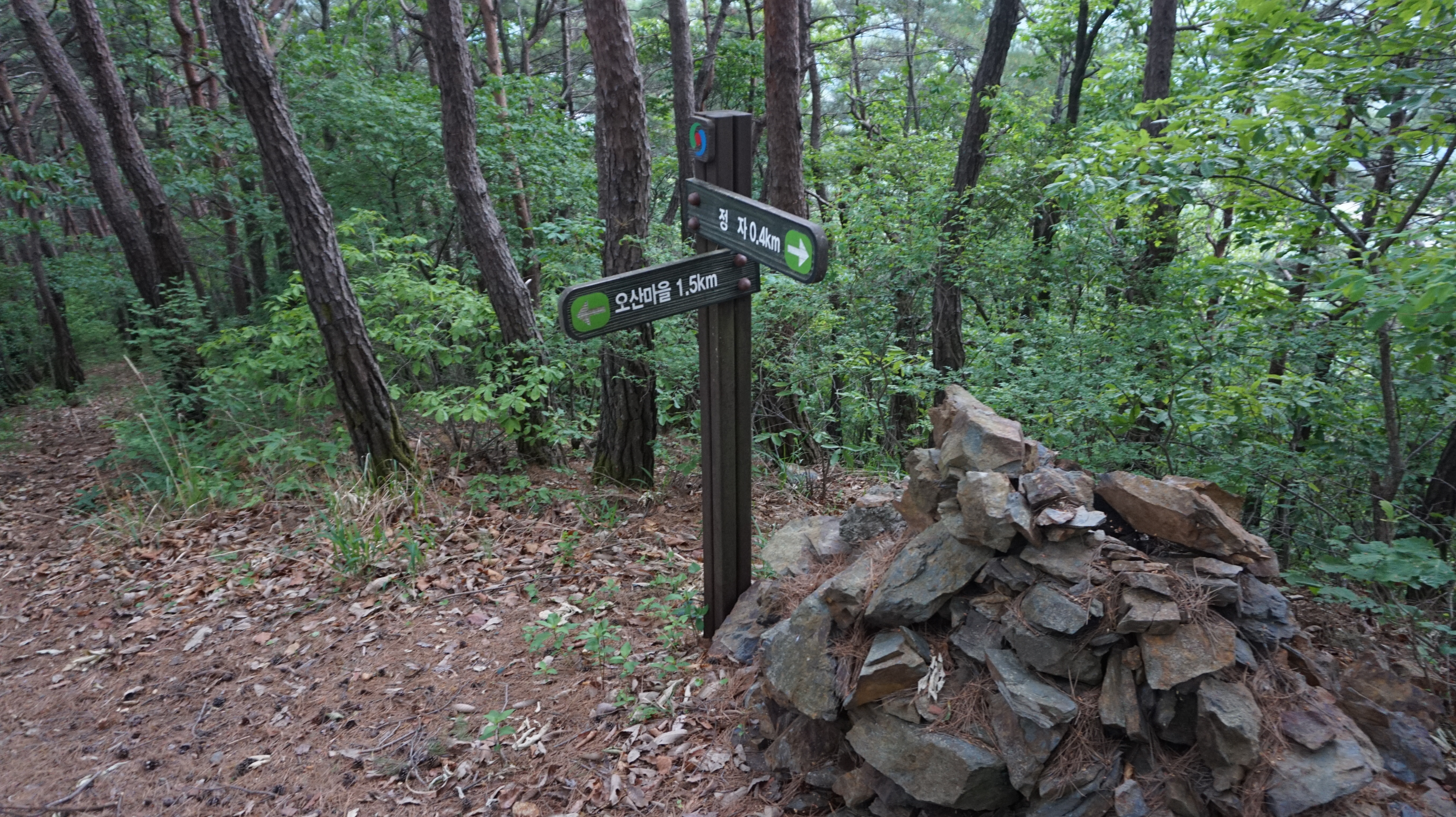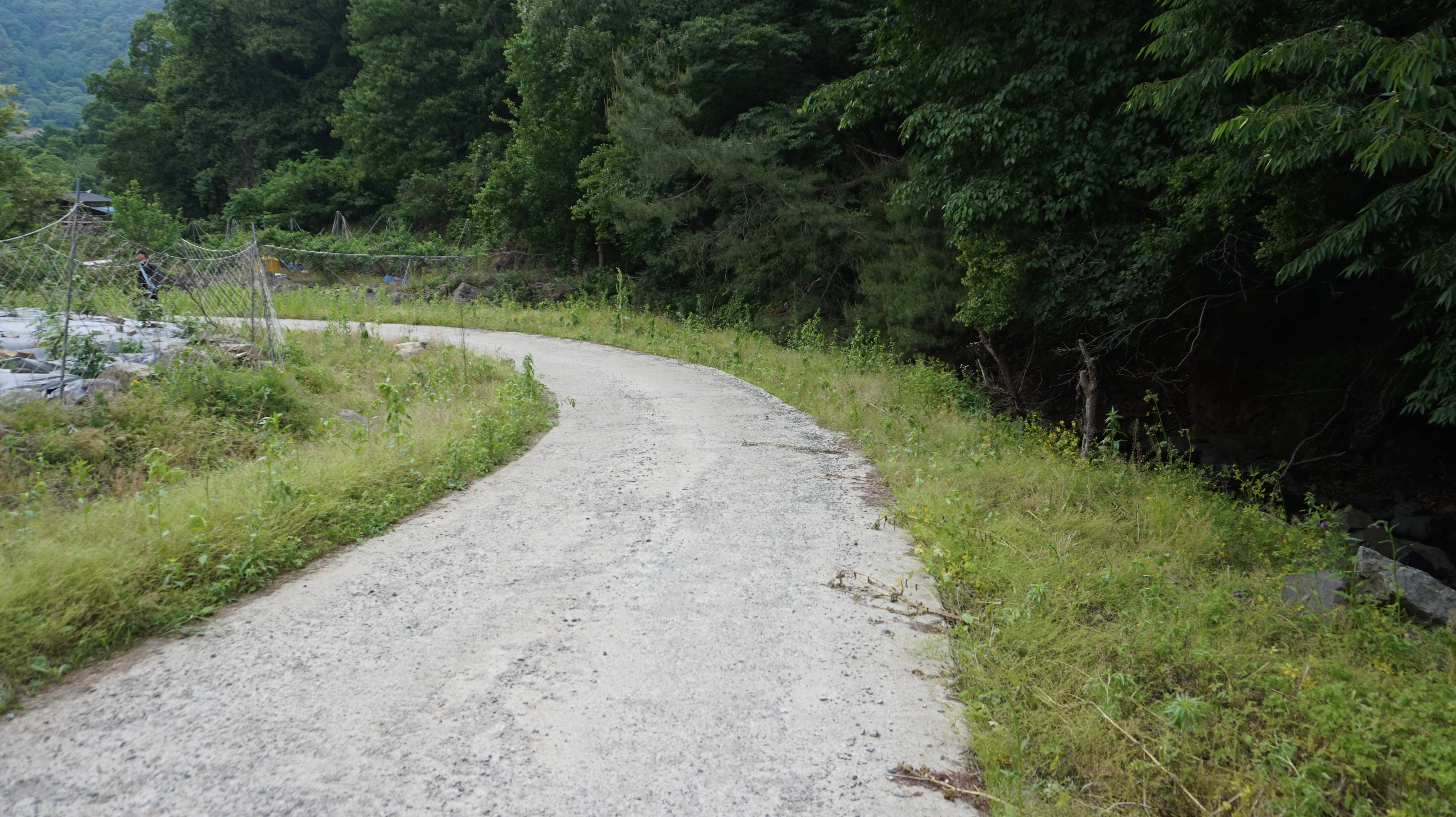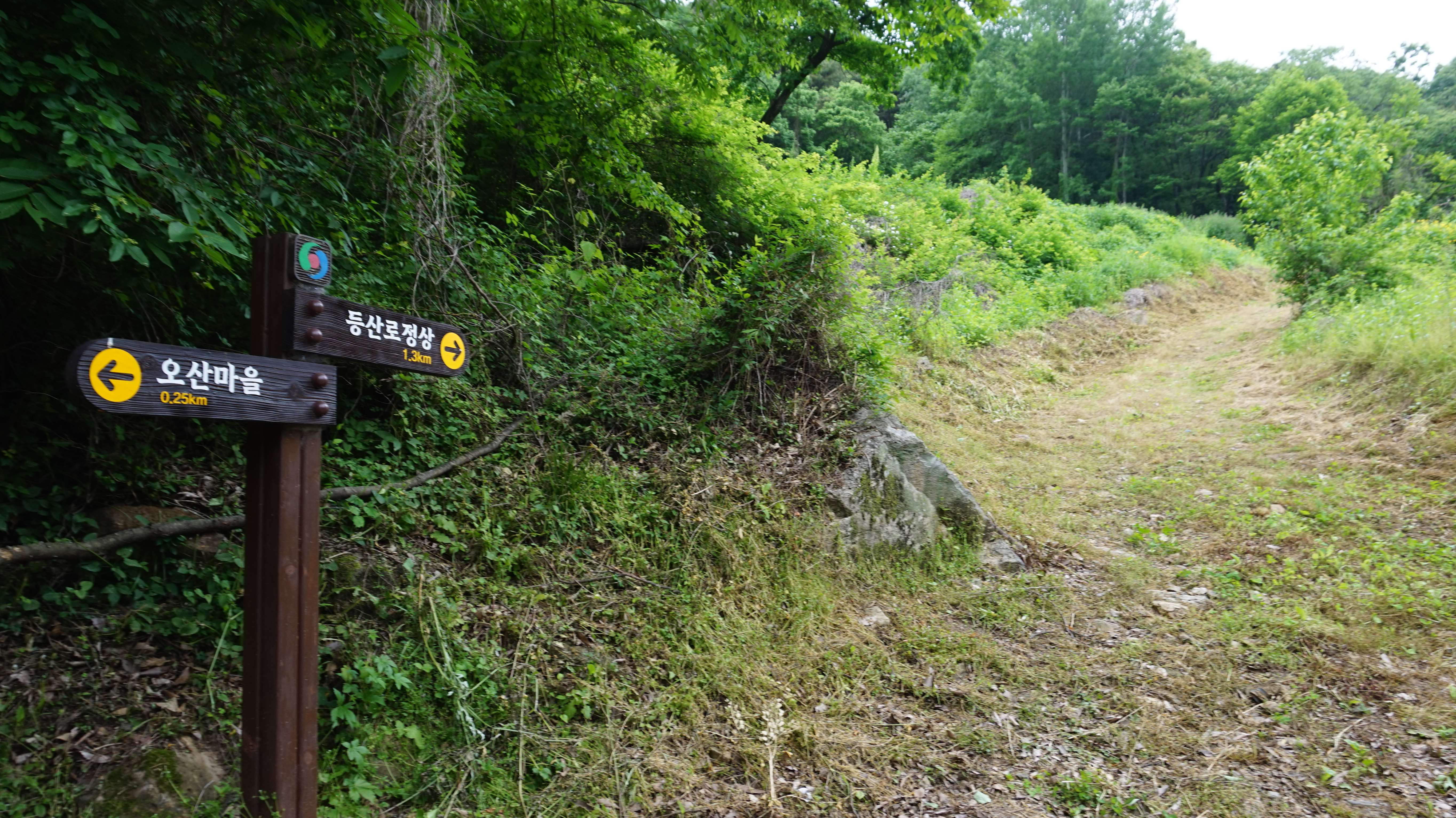거의 다 내려와 이쯤부터 비가오기 시작해 잠시 기다려봤으나 빗줄기가 점점 굵어지니 카메라 배낭에 넣고 우비입고, 오산마을과 오산정류장 지나 산악회버스가 주차돼 있는 장소로 20분쯤 이동 합니다 (14:01)