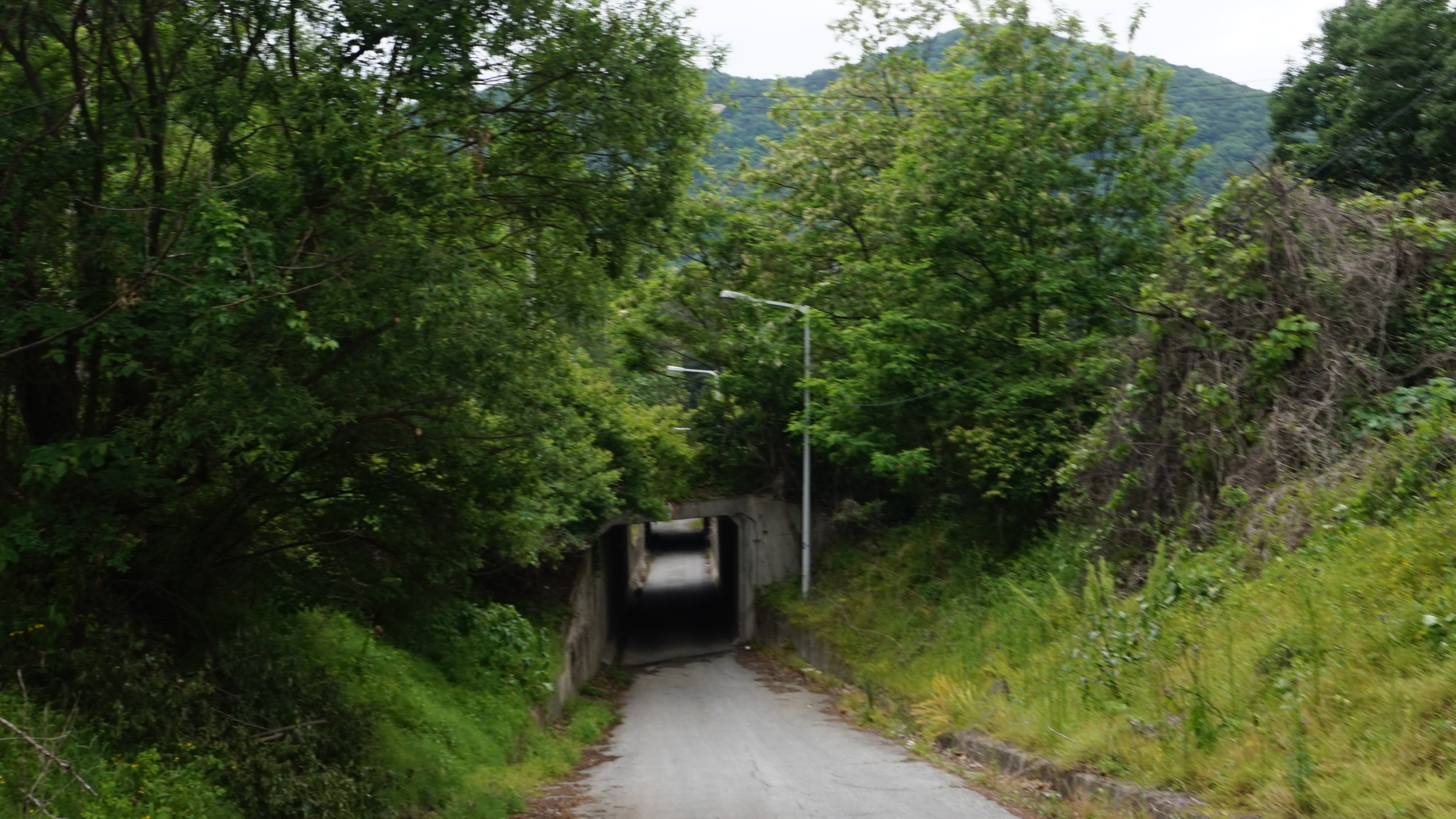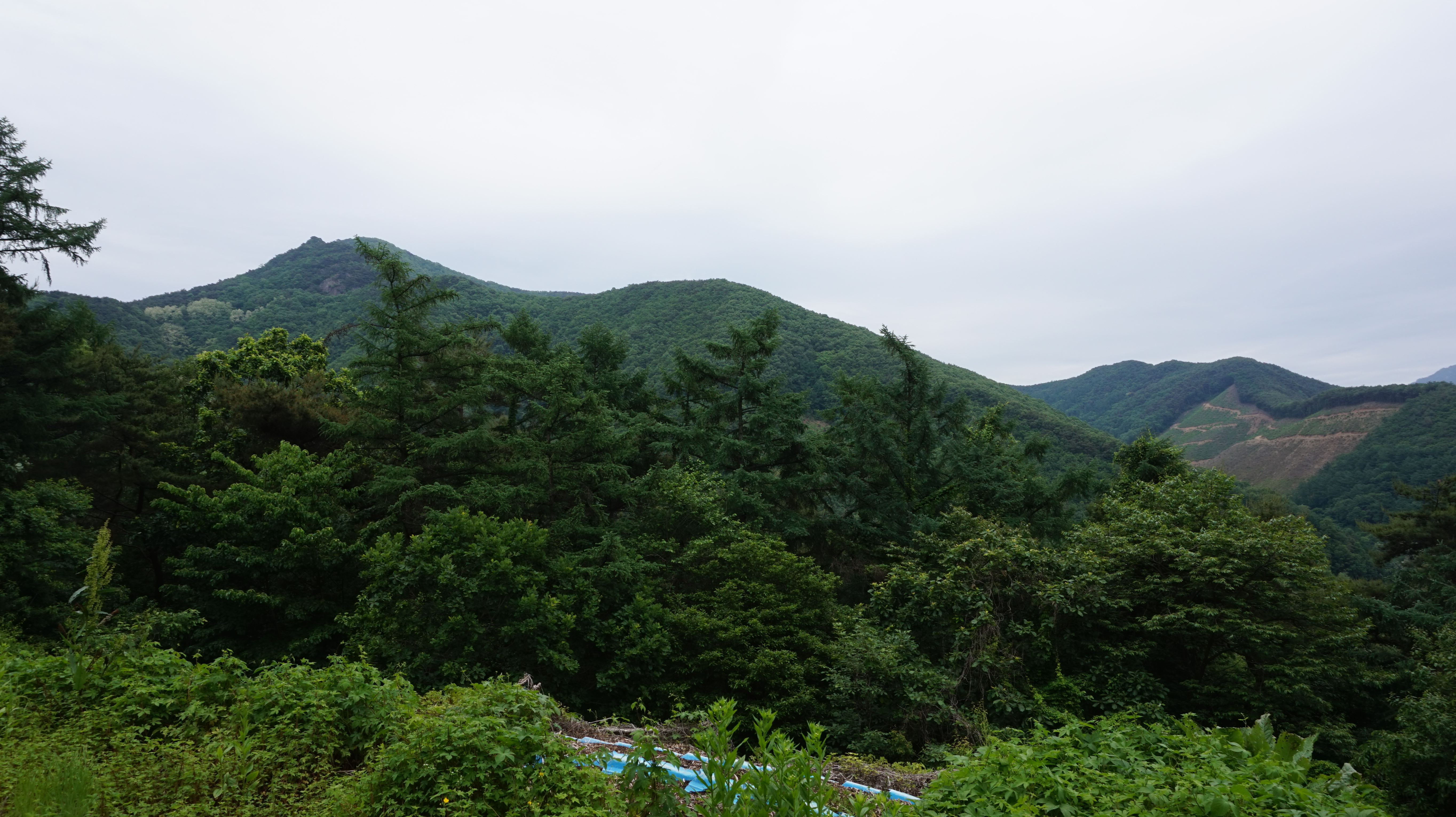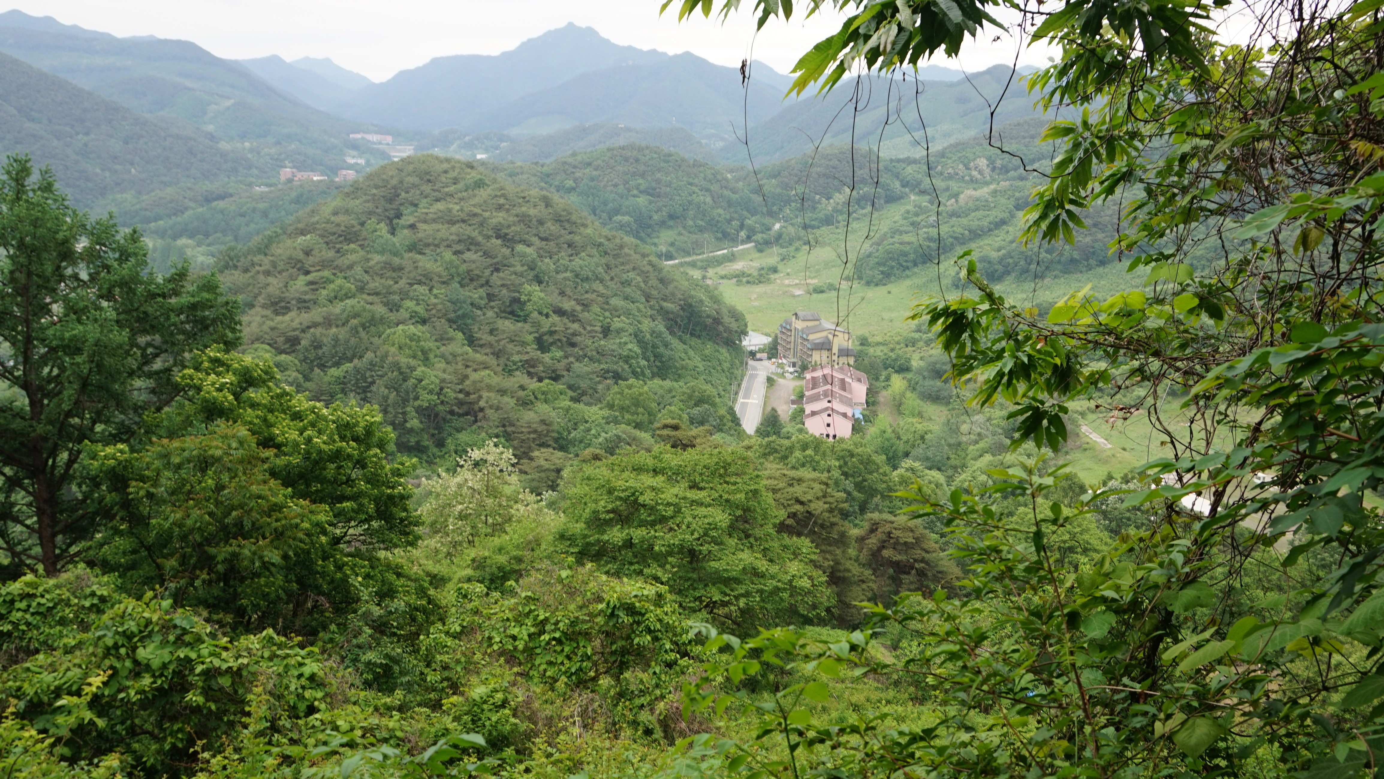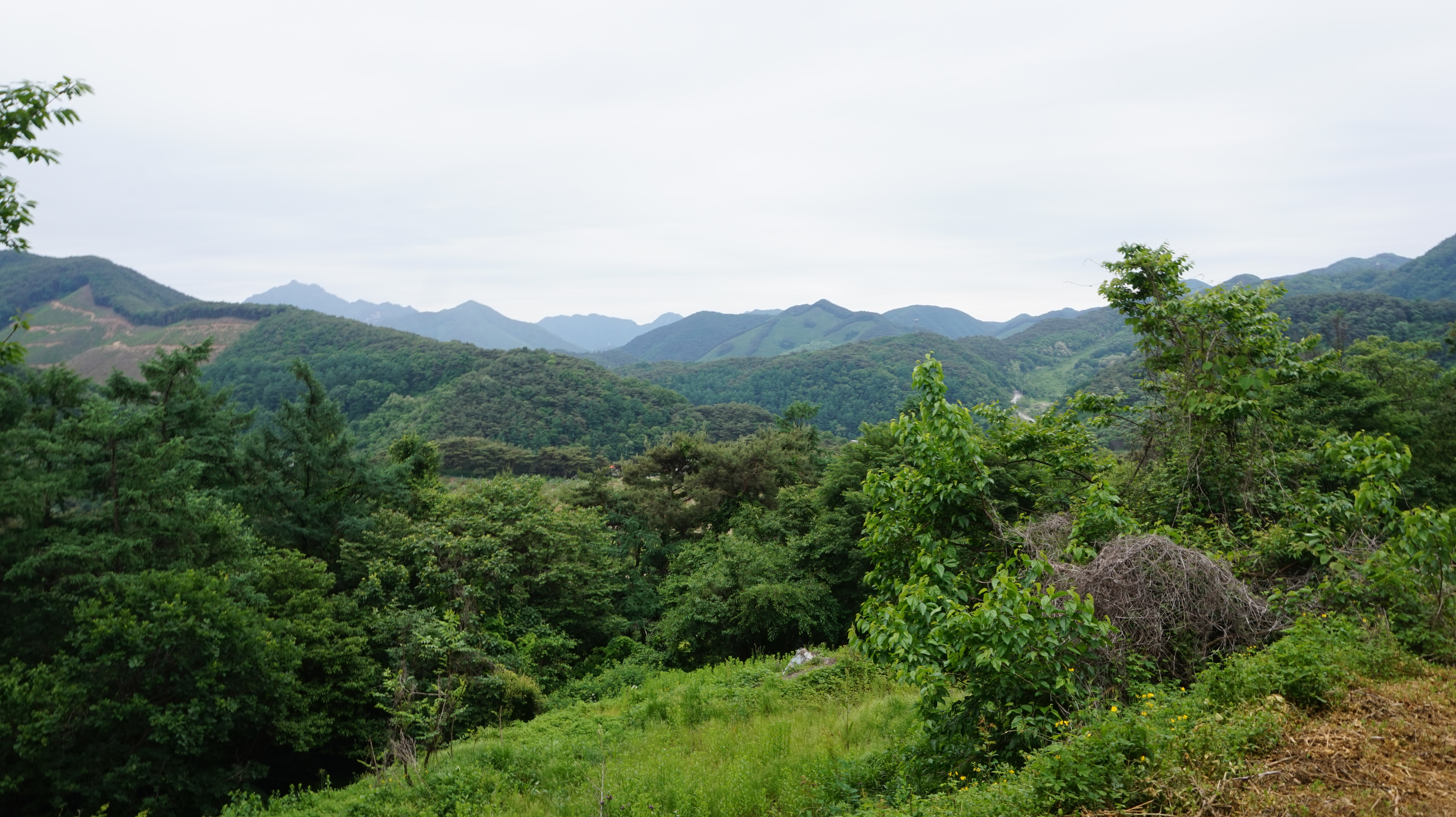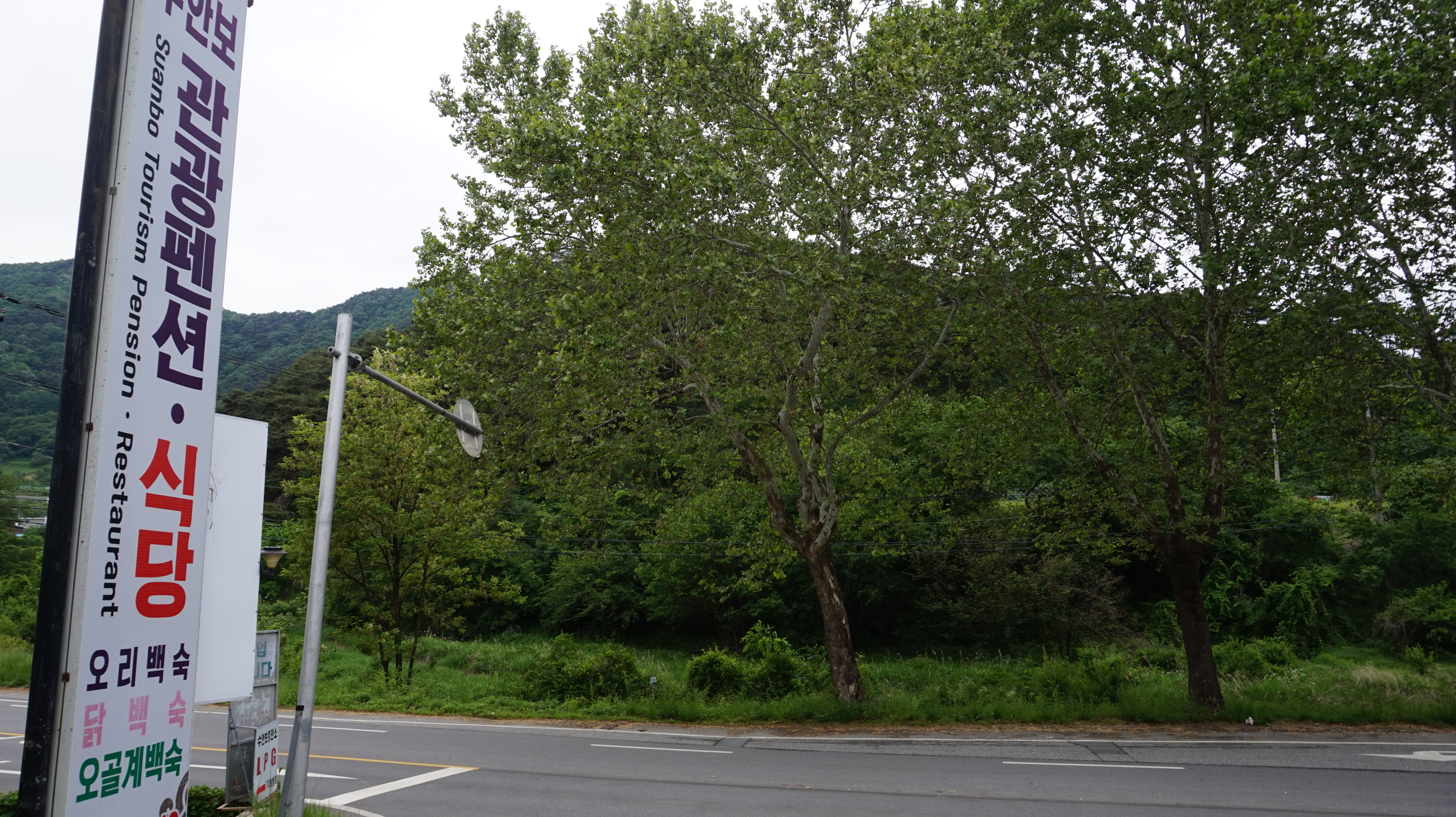 거의 다 내려와 이쯤부터 비가오기 시작해 잠시 기다려봤으나 빗줄기가 점점 굵어지니 카메라 배낭에 넣고 우비입고, 오산마을과 오산정류장 지나 산악회버스가 주차돼 있는 장소로 20분쯤 이동 합니다 (14:01)
