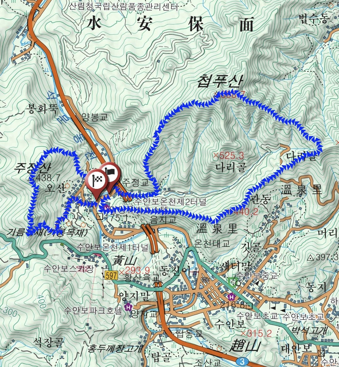 산행코스 : 로프캠프 - 정자 - 삼거리 - 북봉 - 적보산(첩푸산) - 청풍대 - 토끼굴 - 주정소교 - 사각정자 - 주정산 안내도 - 주정산 - 봉수대 - 430봉 - 갈림길 - 오산1길 - 오산정류장 (약 10.5키로)