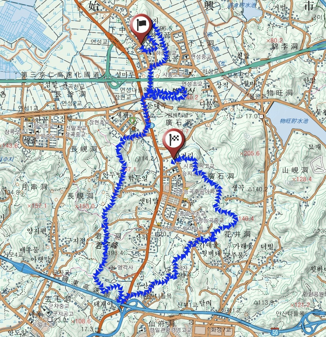 노인전문 시흥병원에서 약 1.3키로 도보이동한 시흥시청 길건너 윗쪽에 들머리가 있고