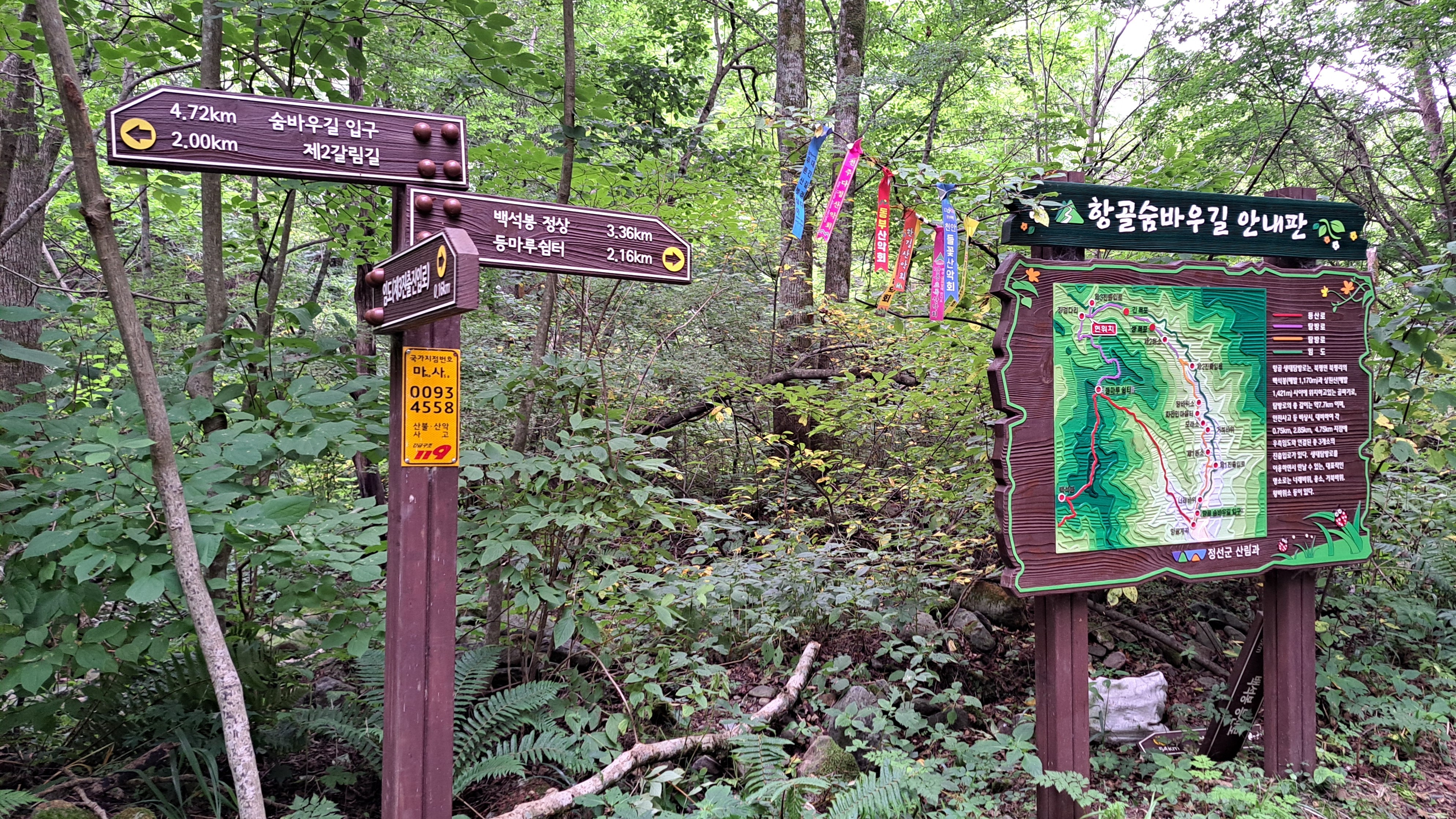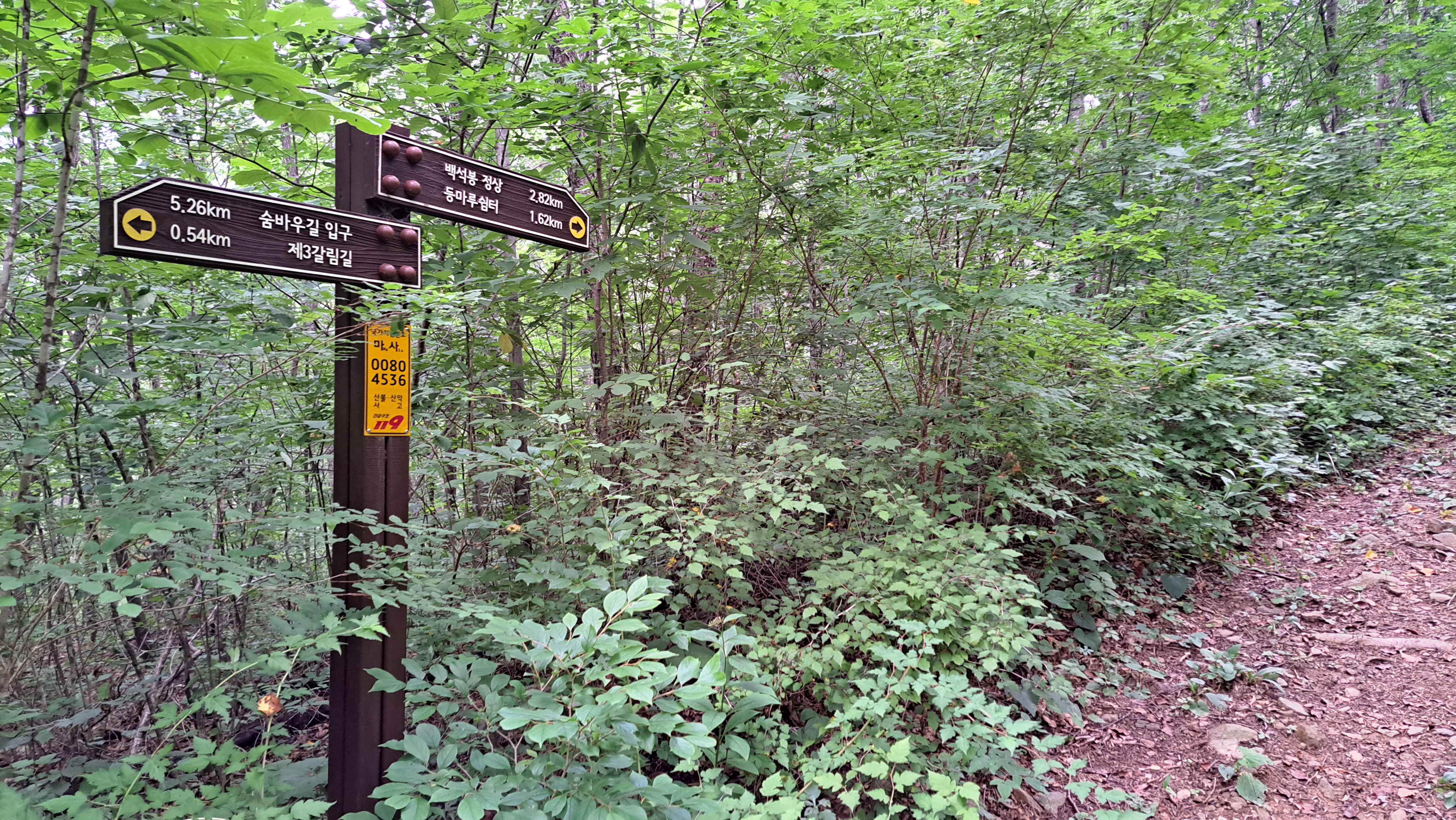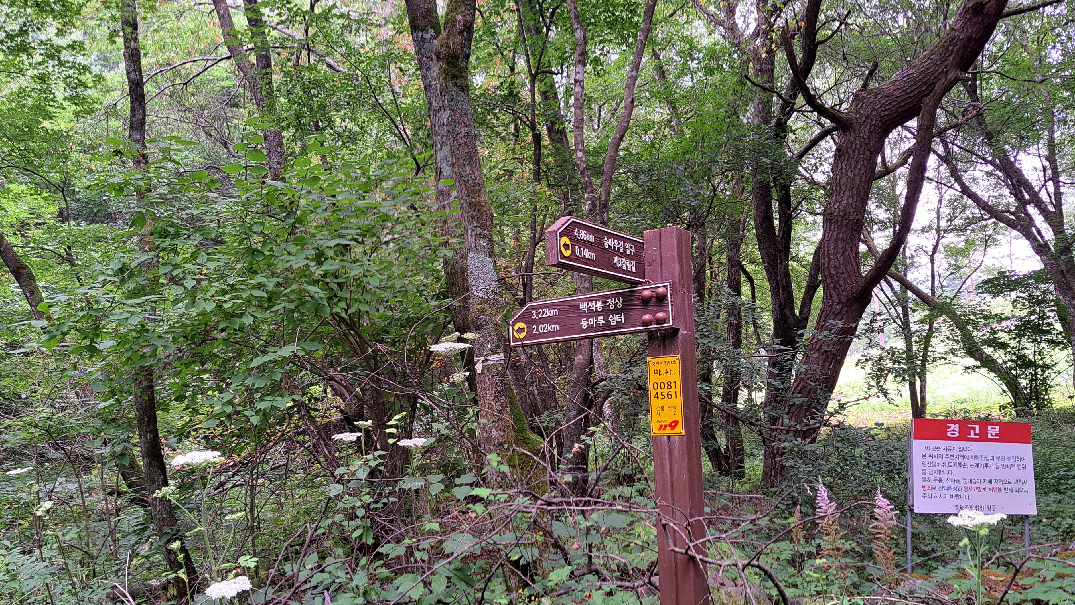 주차장에서 약300미터 진행한 이곳에서 좌측으로 오르면 등마루쉼터와 백석봉(왕복)으로 갈수있고 우측으로 갑니다