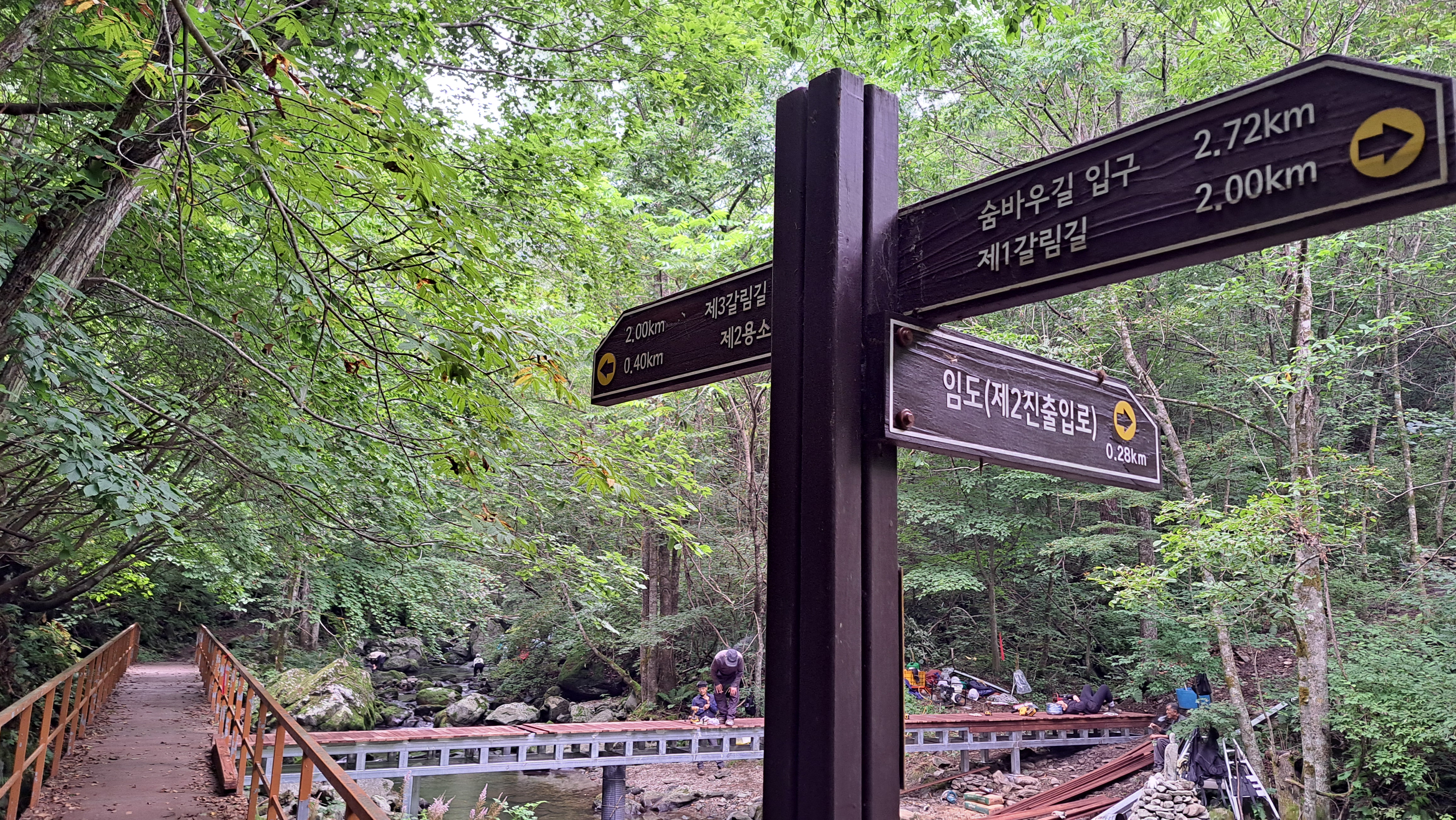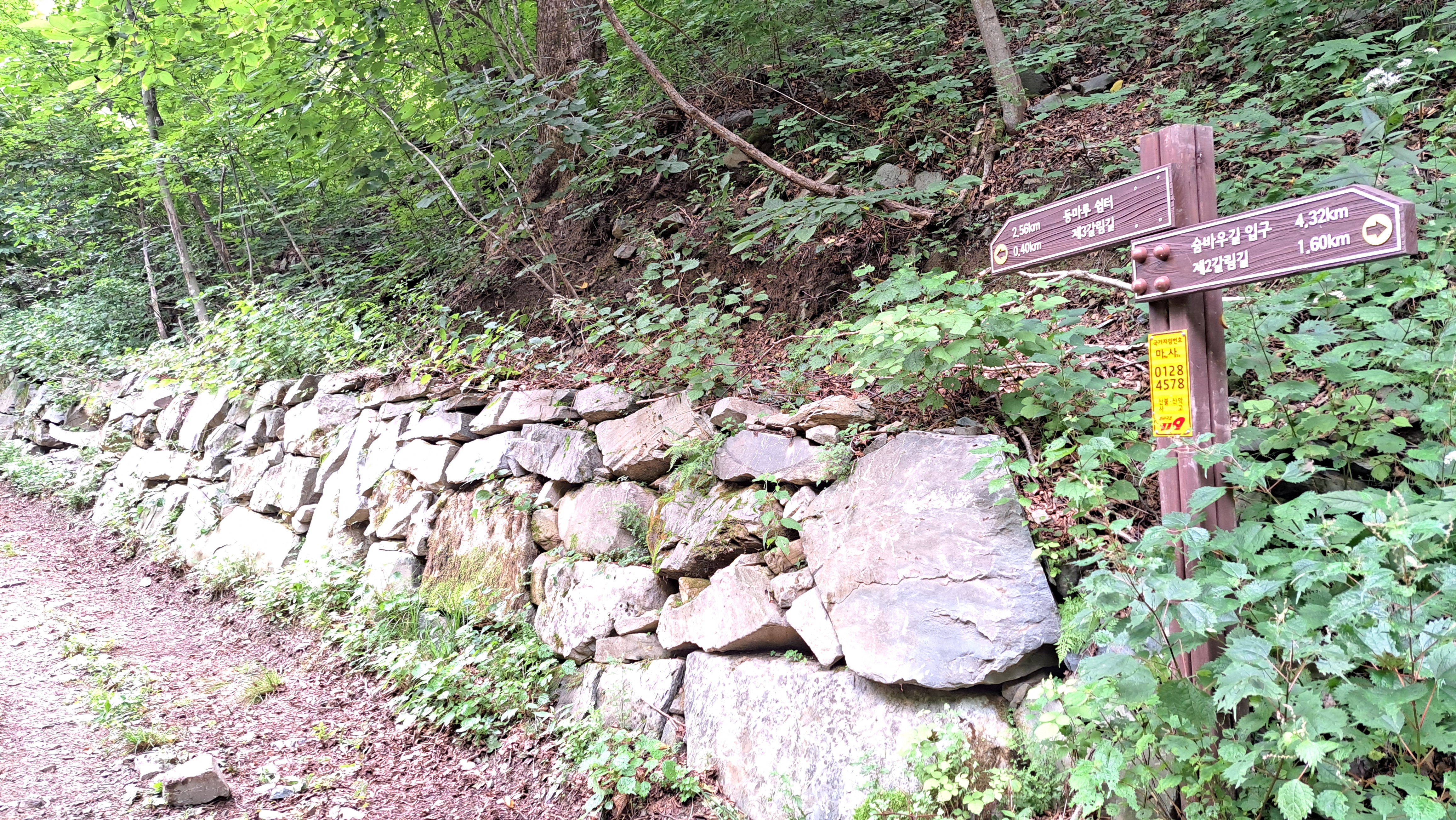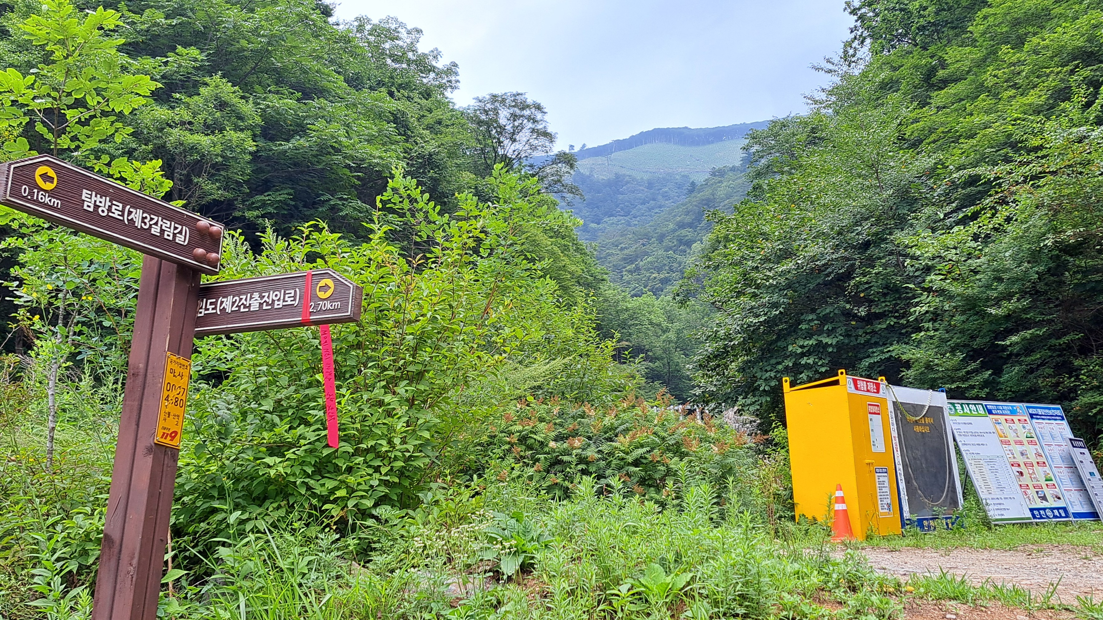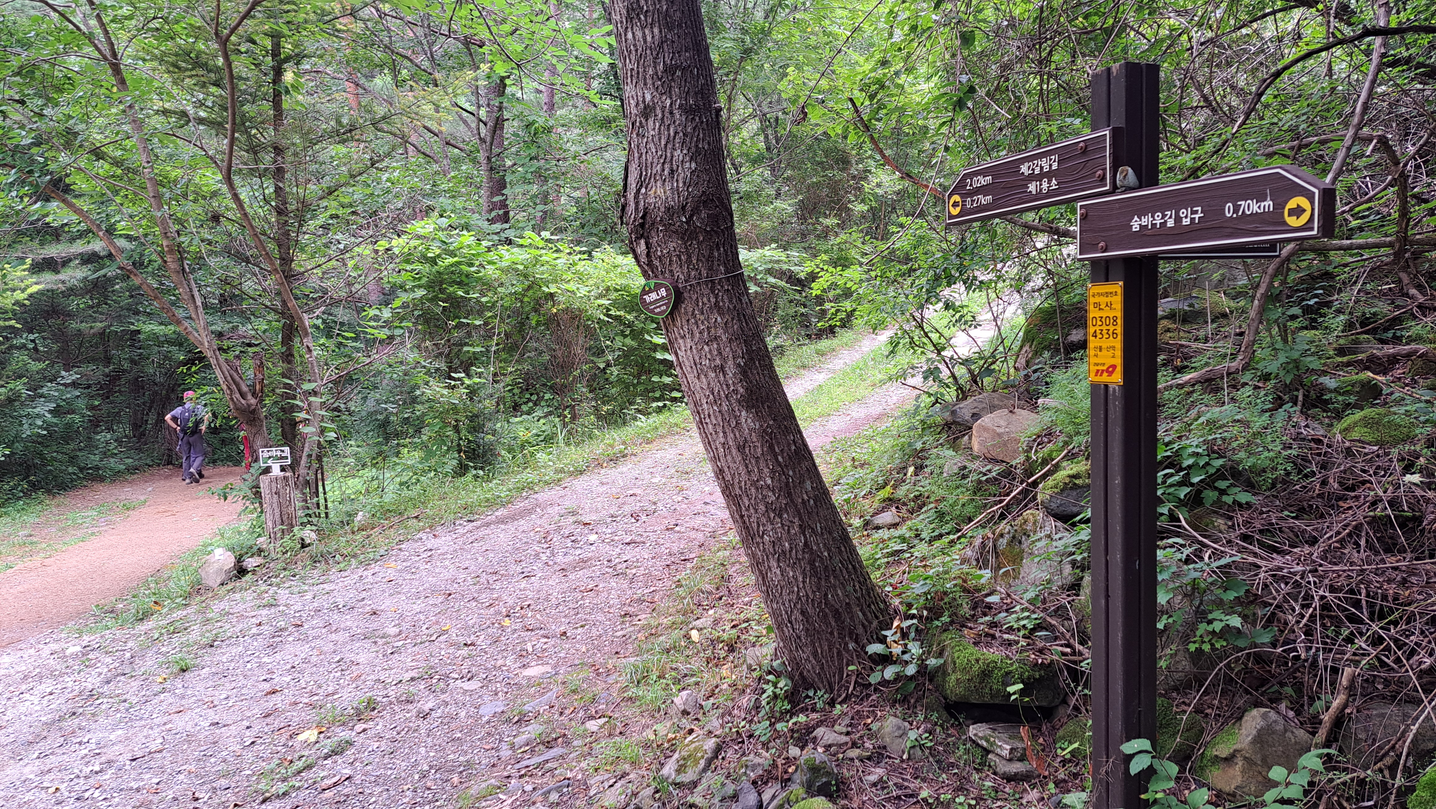 주차장에서 약300미터 진행한 이곳에서 좌측으로 오르면 등마루쉼터와 백석봉(왕복)으로 갈수있고 우측으로 갑니다