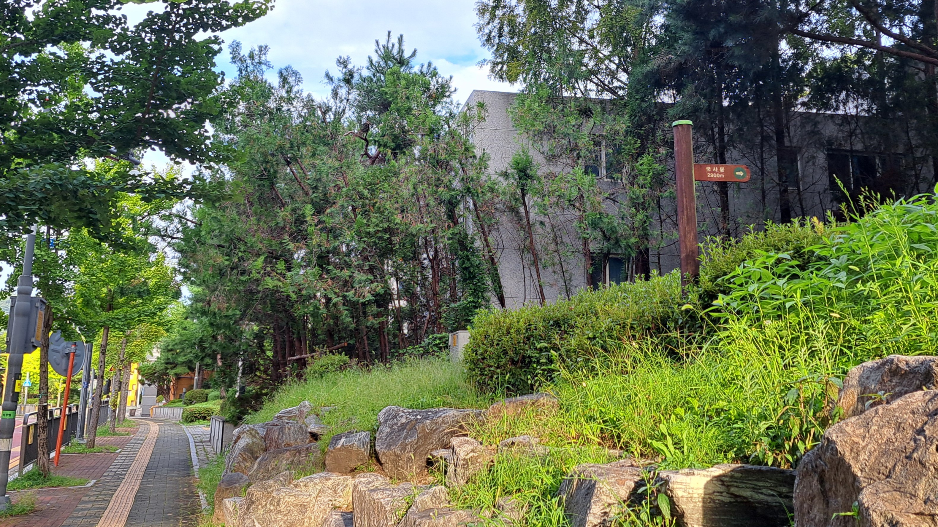 이정표 만나 이정표상 '판교도서관 1단지 실개울마당' 방향으로 하산합니다