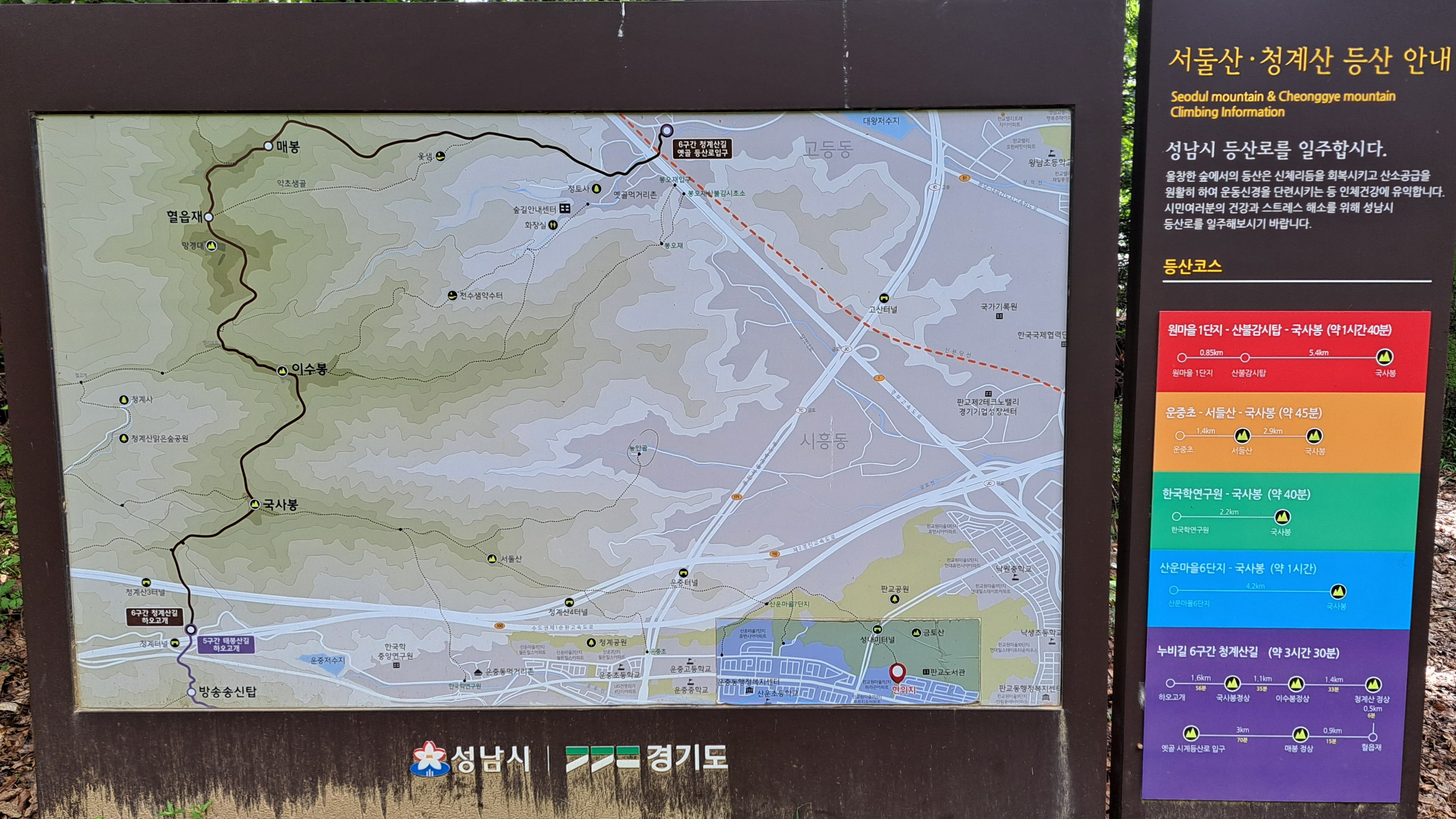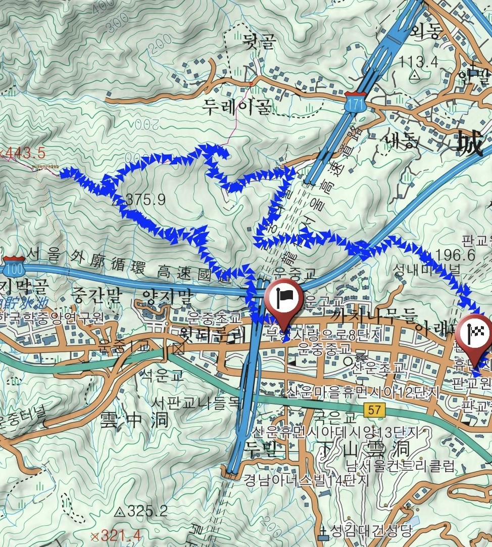 산행코스 : 운중고등학교 정류장 - 국사봉 들머리 이정표 - 서돌산 - 삼거리 - 413봉(왕복) - 금토동 갈림길 - 머금이산(왕복) - 정일당 강씨사당 - 안양성남 고속도로 지하통로 - 사거리 - 서둘산 - 수도권 제1순환 고속도로 지하통로 - 금토산 - 판교 원마을 1,2단지 정류장 (약 10.5키로)