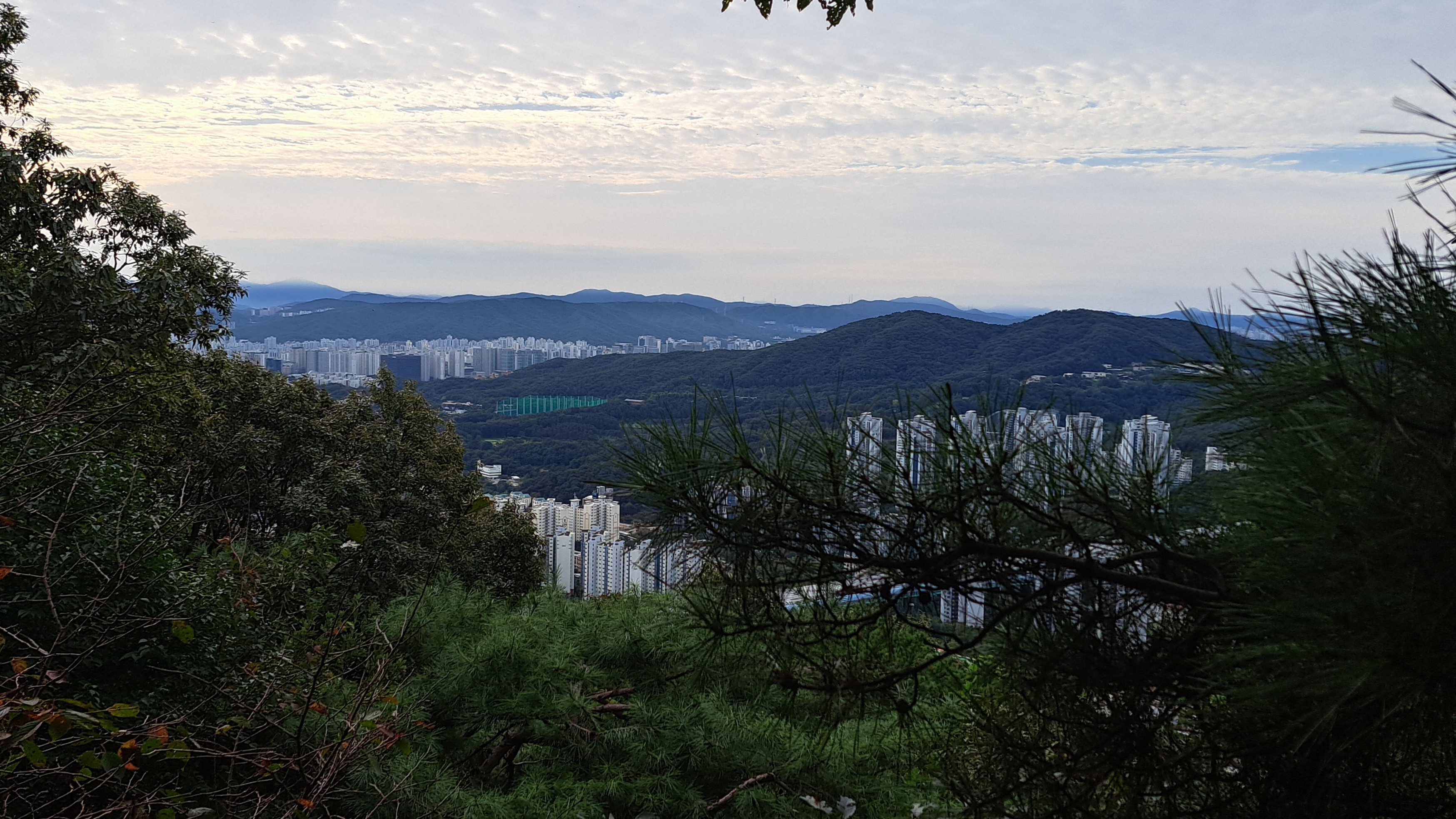 진행해온 방향 돌아보니 위에 용인-서울 고속도로가 보이고 밑에 진행해온 산운로가 보입니다